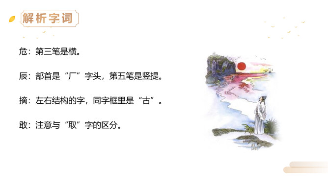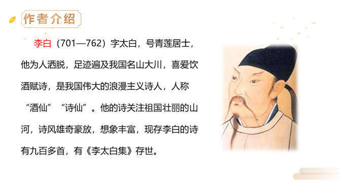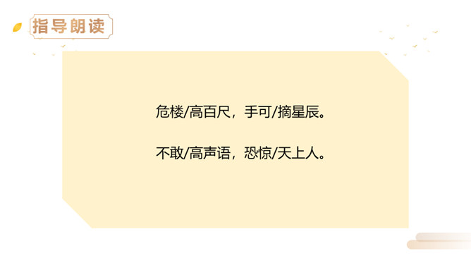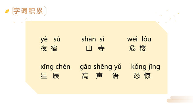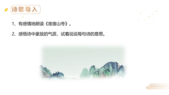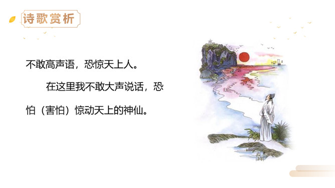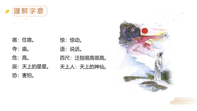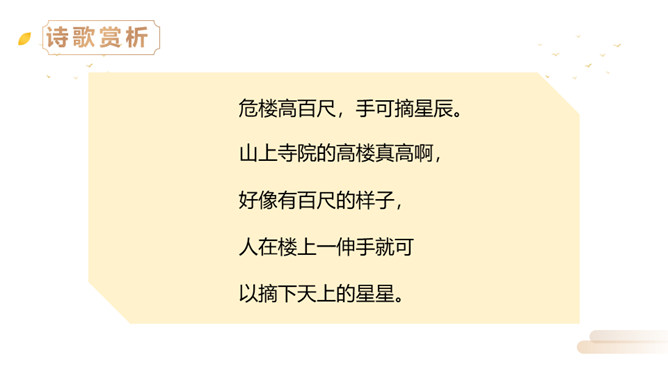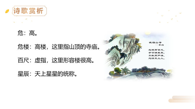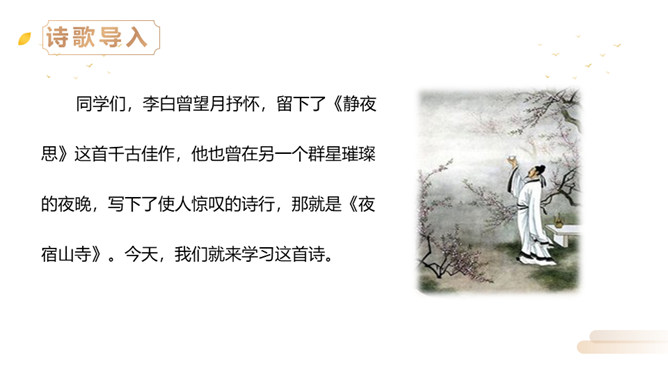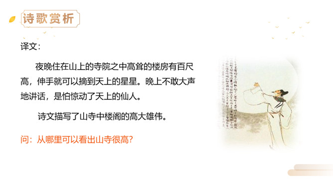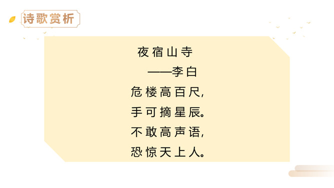同学们,李白曾望月抒怀,留下了《静夜思》这首千古佳作,他也曾在另一个群星璀璨的夜晚,写下了使人惊叹的诗行,那就是《夜宿山寺》。今天,我们就来学习这首诗。有感情地朗读。感悟诗中豪放的气质,试着说说每句诗的意思。夜晚住在山上的寺院之中高耸的楼房有百尺高,伸手就可以摘到天上的星星。晚上不敢大声地讲话,是怕惊动了天上的仙人。诗文描写了山寺中楼阁的高大雄伟。问:从哪里可以看出山寺很高?所属专题:夜宿山寺ppt。