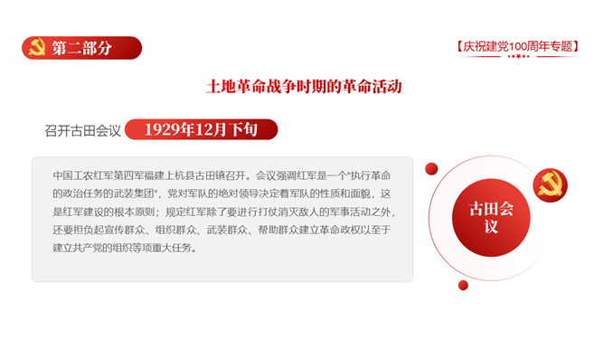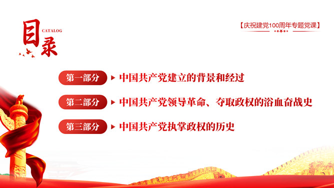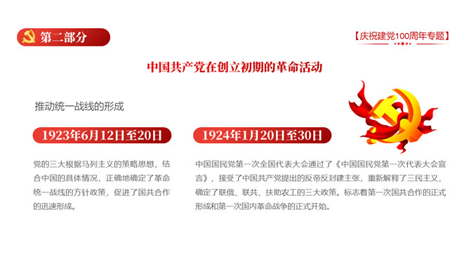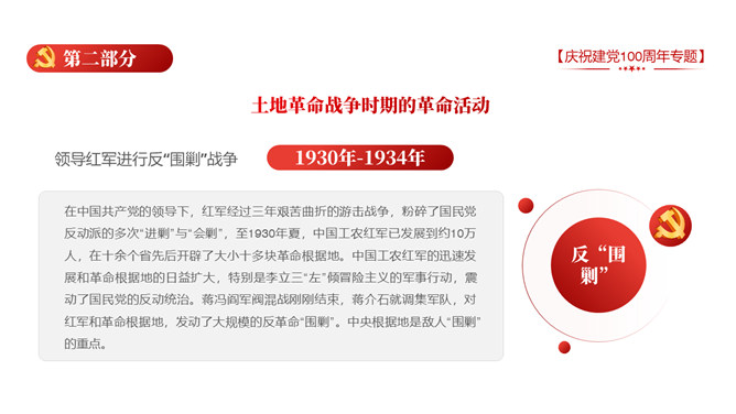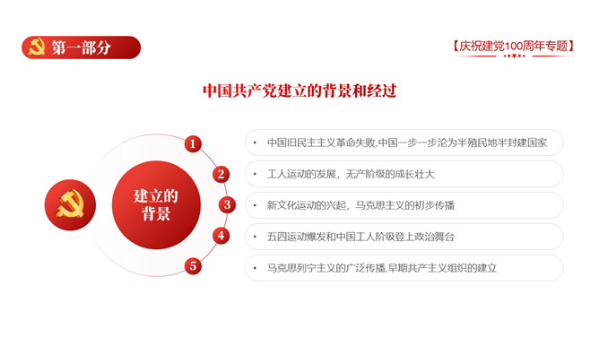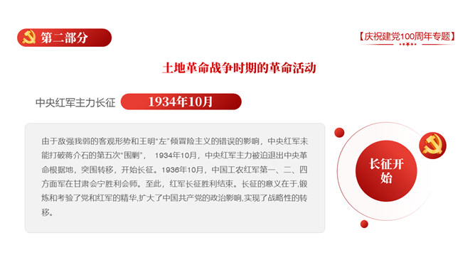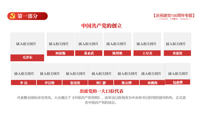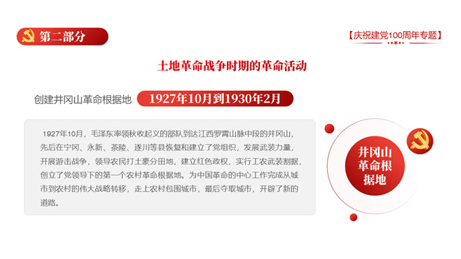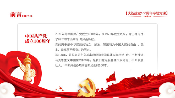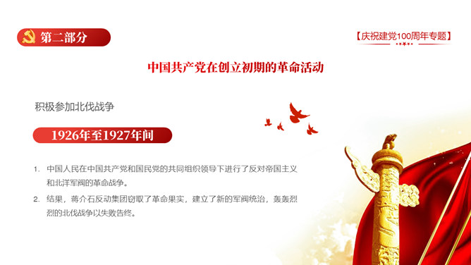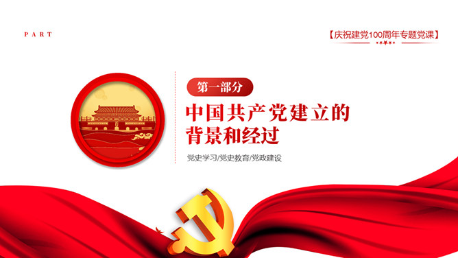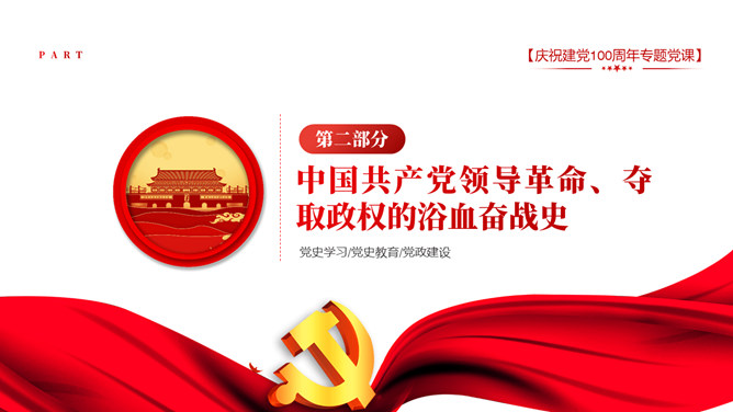 庆祝建党100周年党史学习PPT模板。一套庆祝建党百年暨党史学习主题幻灯片模板,包括中国共产党建立的背景和经过、领导革命和夺取政权的浴血奋战史、执掌政权的历史。