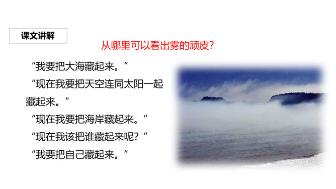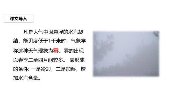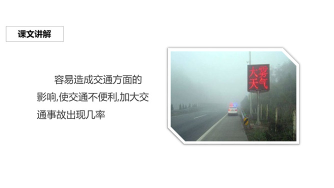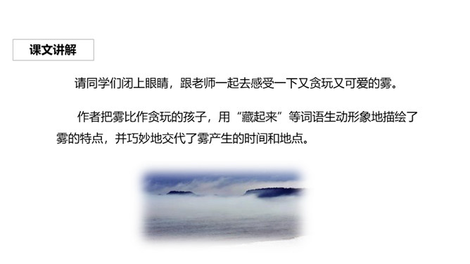 请同学们闭上眼睛,跟老师一起去感受一下又贪玩又可爱的雾。作者把雾比作贪玩的孩子,用“藏起来”等词语生动形象地描绘了雾的特点,并巧妙地交代了雾产生的时间和地点。作者以拟人的手法,形象生动的动词贴切地描写了雾娃娃顽皮、可爱的样子,同时巧妙地融入了日出雾散的自然知识。搜集、整理有关雾的资料,确定相关主题,制作一份电脑小报。参考收集的资料,设计一份导游词。小组交流:介绍自己游览过的或想游览的旅游地,最好讲清它的特色。所属专题:雾在哪里ppt。