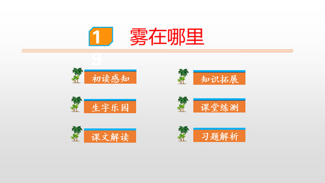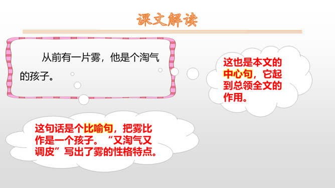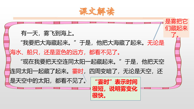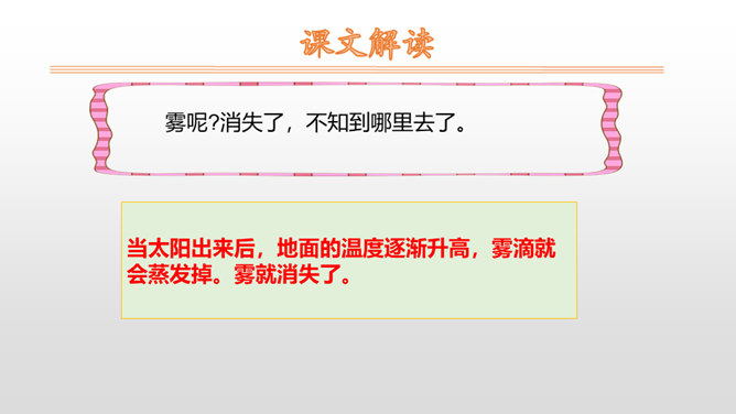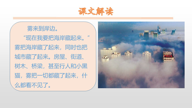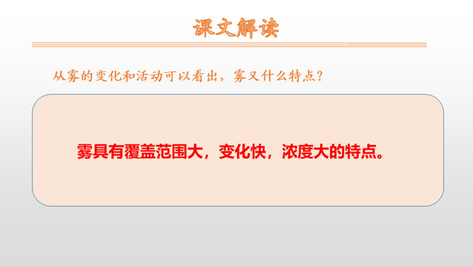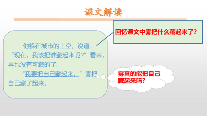 1.朗读课文,读好雾说话时的语气。思路提示:读雾说的话时语调要轻松愉快,要读出雾的淘气。2.读句子,照样子说一说:雾都把什么藏了起来?藏起来之后的景色是什么样的?参考答案:雾把田野藏了起来。无论是果园、山坡,还是缓缓流淌的小河,都看不见了。3.课文说雾“是个淘气的孩子”,在你眼里,雾又是什么呢?参考答案:在我眼里雾是一个爱玩又聪明的孩子。从雾的变化和活动可以看出,雾又什么特点?所属专题:雾在哪里ppt。