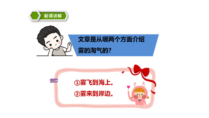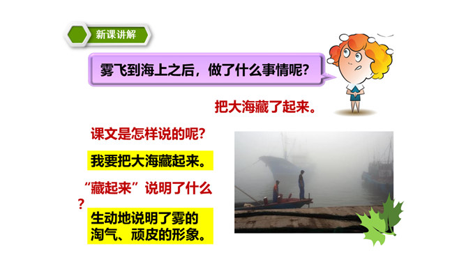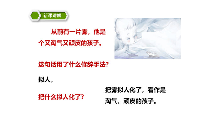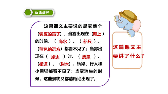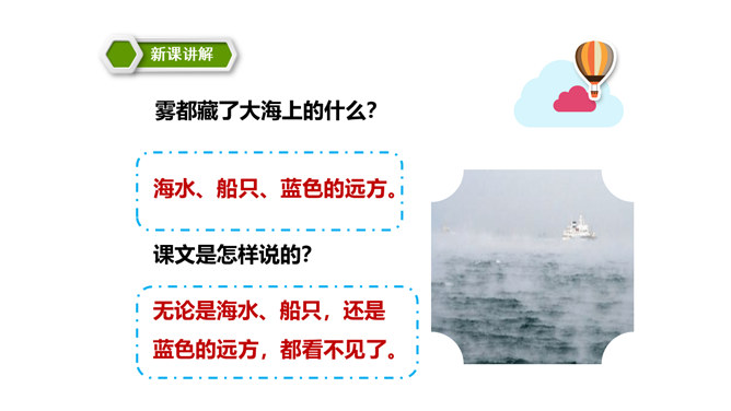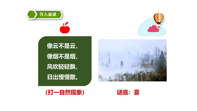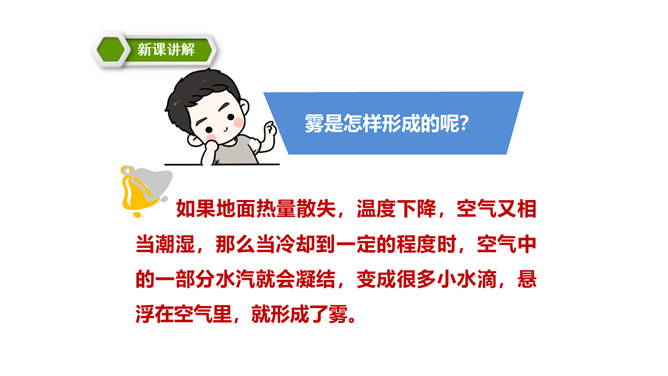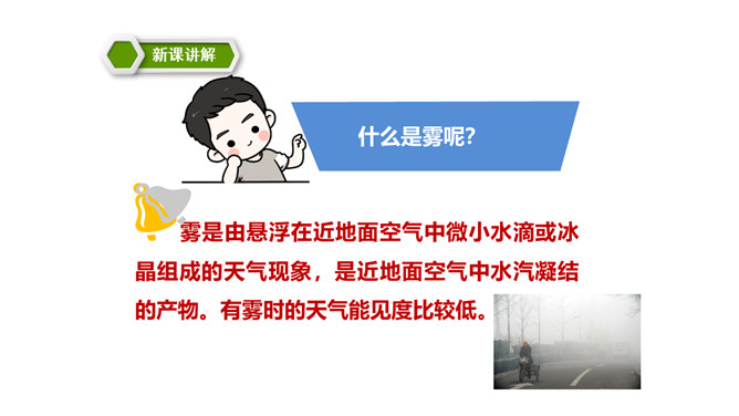 同学们,你们能说一说对“雾”的认识吗?在雾里看不清远处的景物;空气很潮湿;雾一般出现在早晨或傍晚的时候。雾是由悬浮在近地面空气中微小水滴或冰晶组成的天气现象,是近地面空气中水汽凝结的产物。有雾时的天气能见度比较低。 同学们,你们知道雾把自己藏起来之后,为什么一切都变得清晰了吗?因为雾散开了。同学们,课文说雾“是个淘气又顽皮的孩子”,在你眼里,雾又是什么呢?所属专题:雾在哪里ppt。