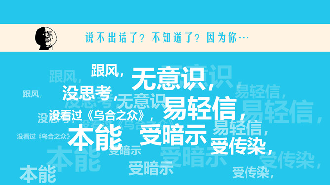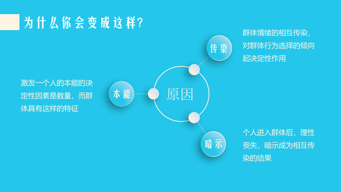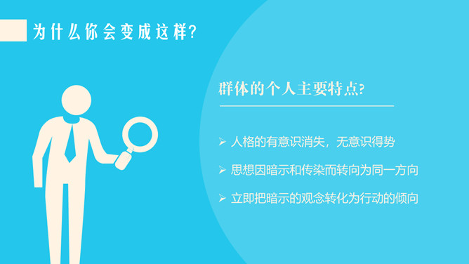 《乌合之众》读书笔记PPT。群体的个人主要特点?人格的有意识消失,无意识得势,思想因暗示和传染而转向为同一方向,立即把暗示的观念转化为行动的倾向。