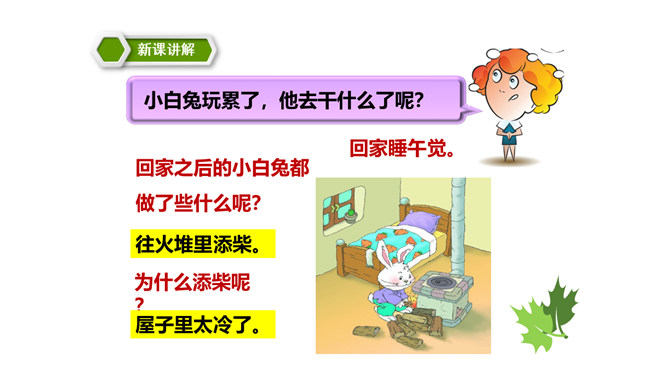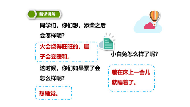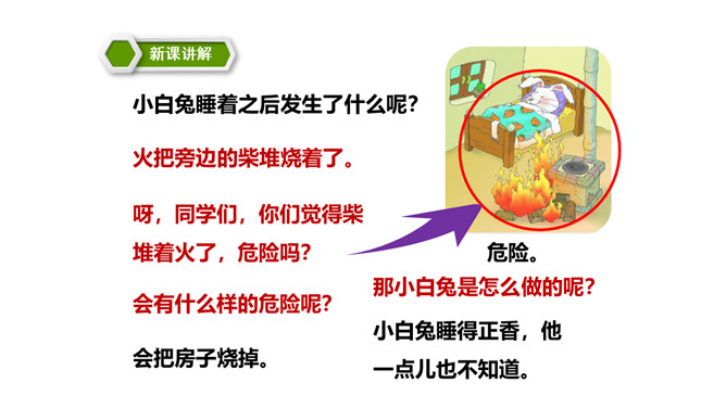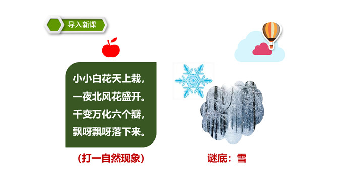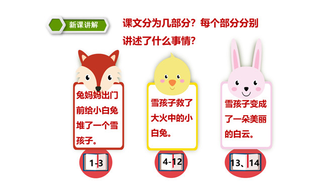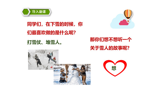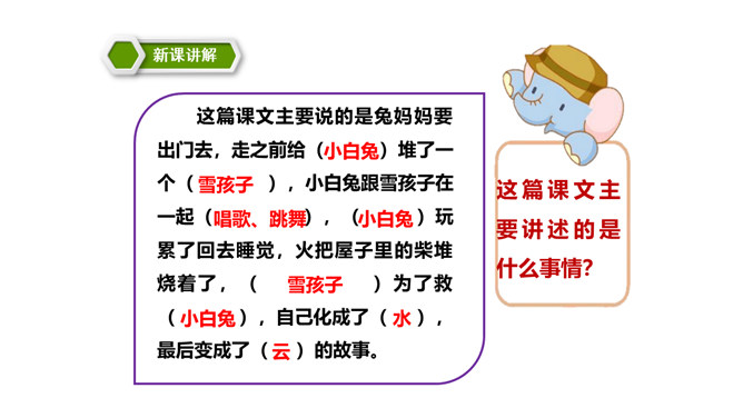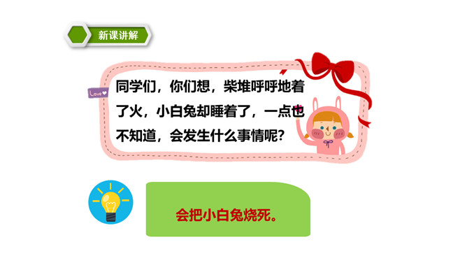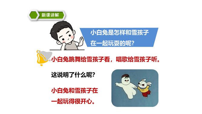 这篇课文讲述了一个给小白兔带来了快乐的可爱的雪孩子,最后为了从大火中救出小白兔而舍弃了自己生命的童话故事。雪孩子的善良、勇敢,告诉我们,当别人有困难时,要勇于伸出援助之手。这篇课文写的是雪孩子给小白兔带来了快乐,最后也因为救小白兔而舍弃了自己的生命。这个故事告诉了我们,要懂得在困难的时候多帮助别人。同学们,你们想,添柴之后会怎样呢?火会烧得旺旺的,屋子会变暖和。所属专题:雪孩子ppt。