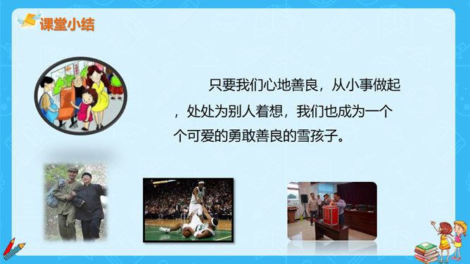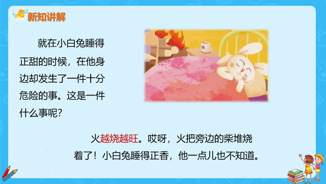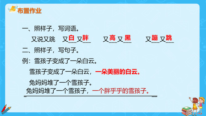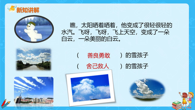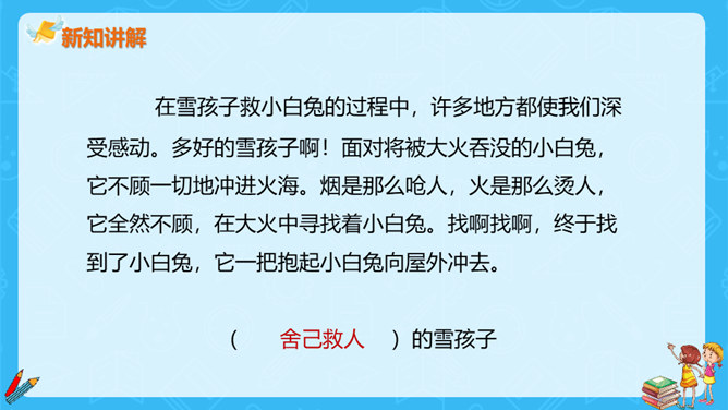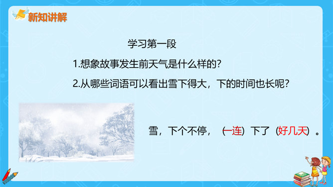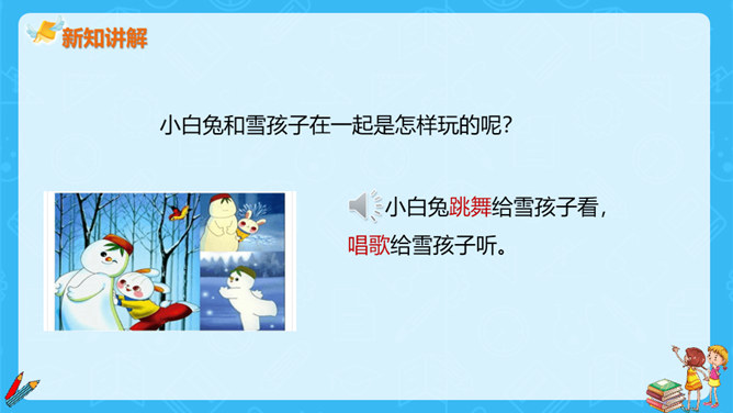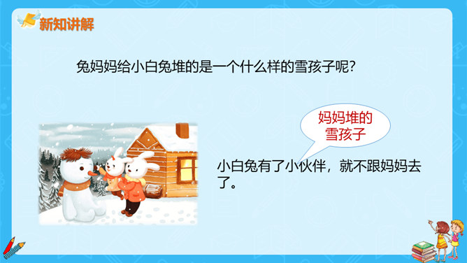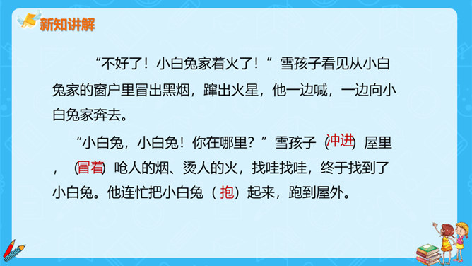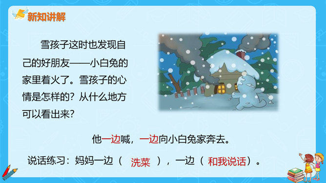 词语挑战赛。读词语,并用这些词语说说雪孩子的故事。1.想象故事发生前天气是什么样的?2.从哪些词语可以看出雪下得大,下的时间也长呢?1.兔妈妈要出门去,小白兔为什么要跟着去?2.为什么小白兔后来又不跟妈妈去了呢?兔妈妈给小白兔堆的是一个什么样的雪孩子呢?小白兔和雪孩子在一起是怎样玩的呢?雪孩子这时也发现自己的好朋友——小白兔的家里着火了。雪孩子的心情是怎样的?从什么地方可以看出来?所属专题:雪孩子ppt。