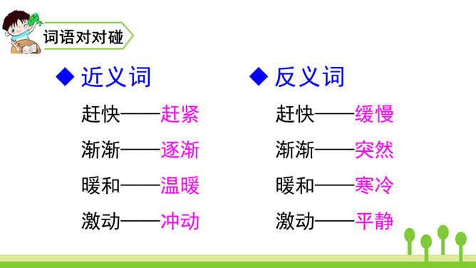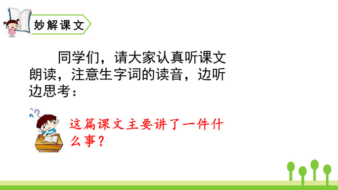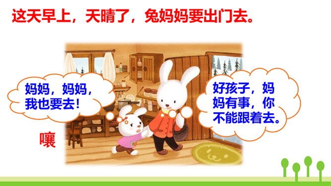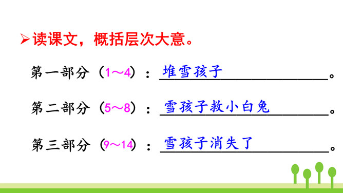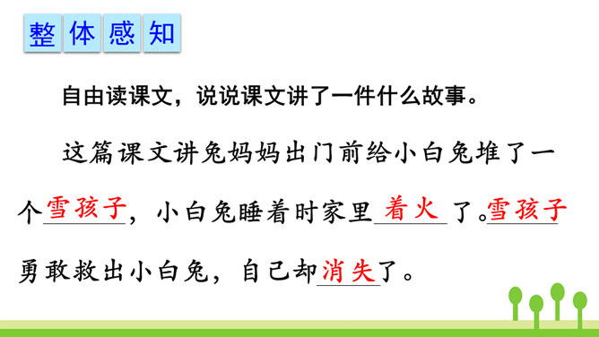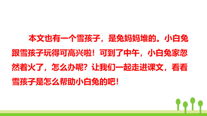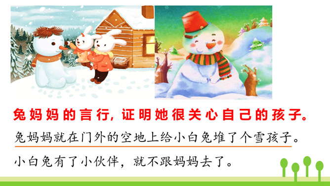 本文也有一个雪孩子,是兔妈妈堆的。小白兔跟雪孩子玩得可高兴啦!可到了中午,小白兔家忽然着火了,怎么办呢?让我们一起走进课文,看看雪孩子是怎么帮助小白兔的吧!兔妈妈看到那朵美丽的云会说些什么?小白兔又会对空中的白云说些什么呢?兔妈妈会说:雪孩子,谢谢你救了小白兔,你的心灵真美。雪孩子会说:亲爱的朋友,谢谢你救了我!我一辈子都不会忘记你,我真心期盼你明年冬天再来跟我玩。所属专题:雪孩子ppt。