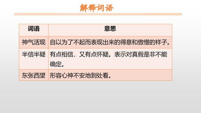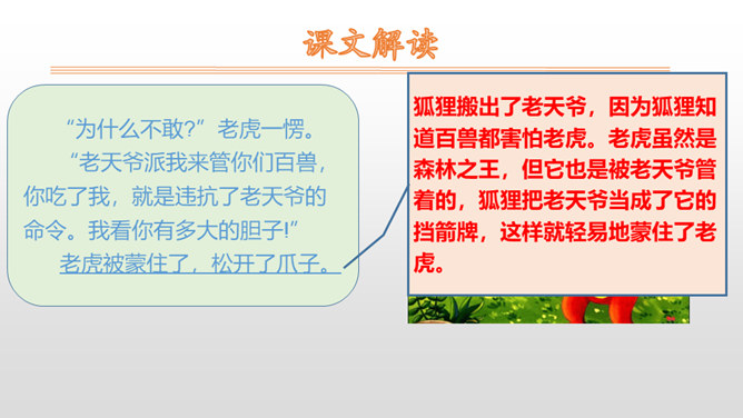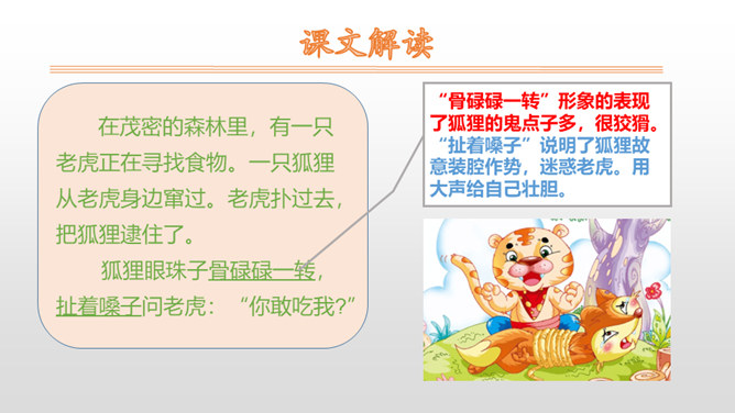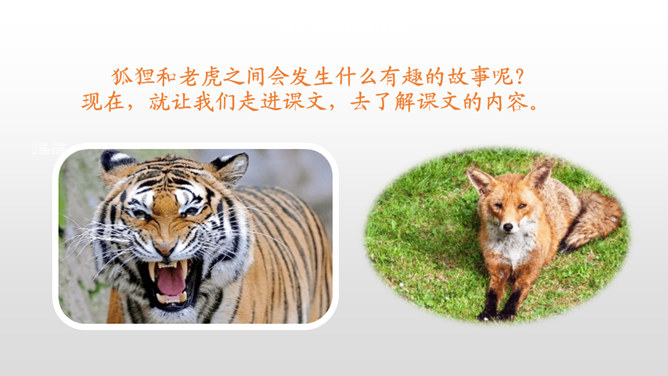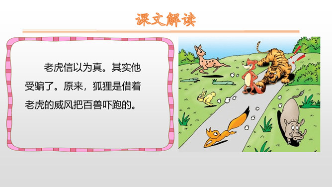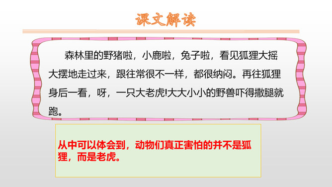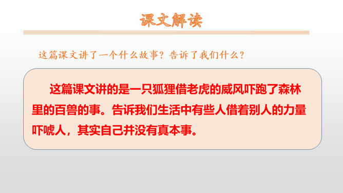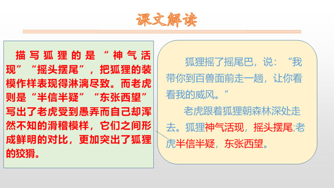1.朗读课文。说说“狐假虎威”这个成语的意思。参考答案:狐狸假借老虎的威势吓跑百兽,比喻倚仗别人的势力来欺压人。2.下面的词语哪些是写狐狸的,哪些是写老虎的?分角色演一演这个故事,试着把这些词语的意思表现出来。(1)参考答案:写狐狸的——神气活现摇头摆尾大摇大摆写老虎的——半信半疑东张西望(2)思路提示:首先,我们要理解这五个词语的意思;然后,确定不同的角色,每个角色都应通过动作、神态充分展示词语所表达的意思;最后,根据自己的生活积累,发挥表演才能,自信、大方地去演!所属专题:狐假虎威ppt。