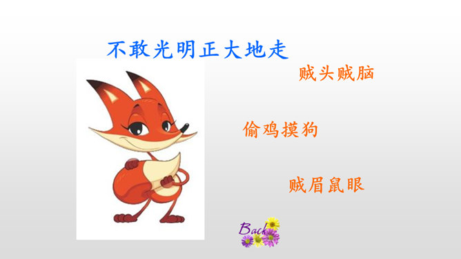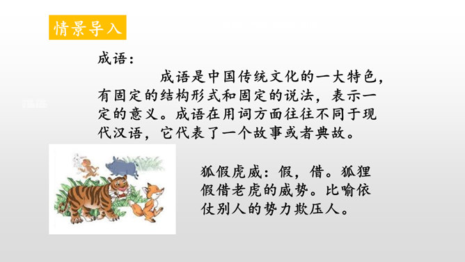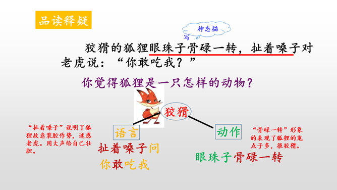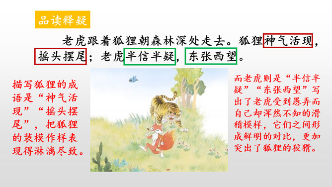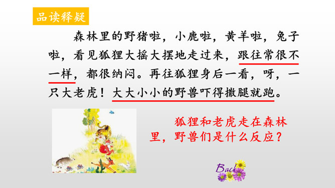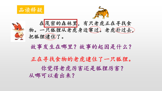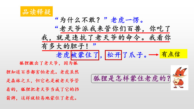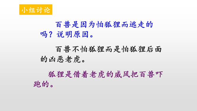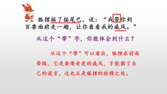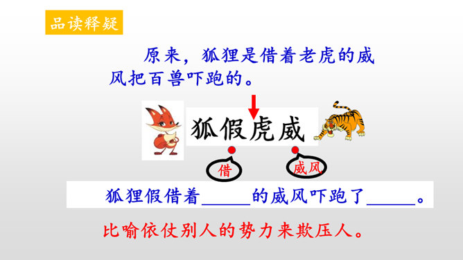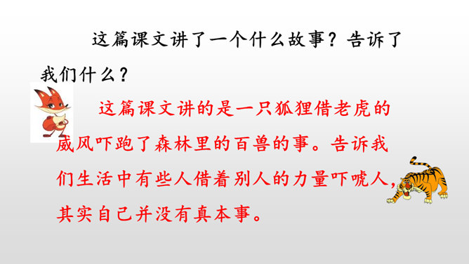 本文讲的是一只狐狸借老虎的威风吓跑了森林里的野兽。告诉我们生活中有些人借着别人的力量吓唬人,其实自己并没有真本事。讽刺了仗势欺人者的奸诈狡猾。演一演,说说你从这个故事中学到了什么?请你根据提示展开想象,续编《狐假虎威》的故事。(提示:后来,老虎明白了百兽是害怕自己才逃跑的……)百兽是因为怕狐狸而逃走的吗?说明原因。百兽不怕狐狸而是怕狐狸后面的凶恶老虎。狐狸是借着老虎的威风把百兽吓跑的。所属专题:狐假虎威ppt。