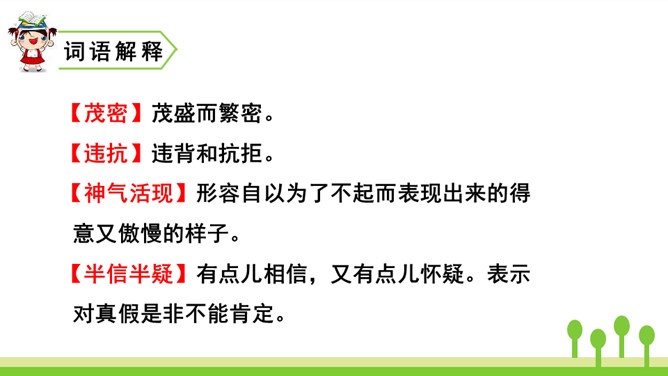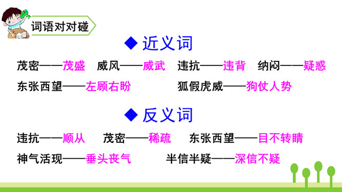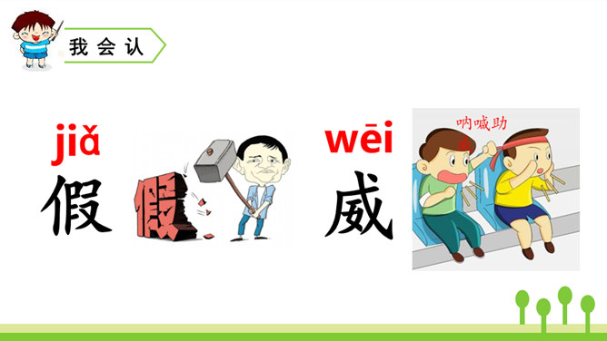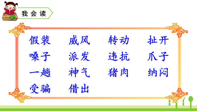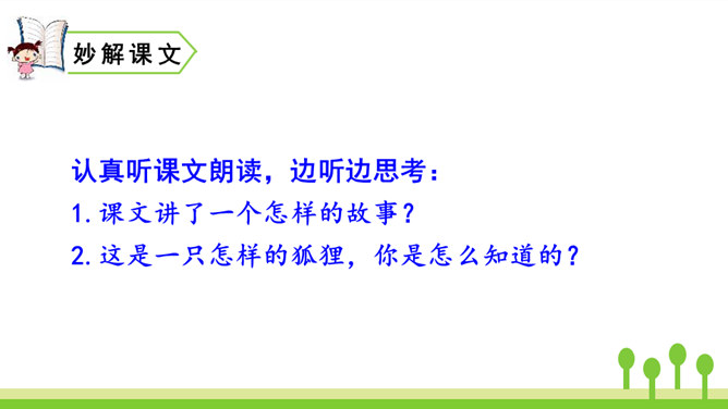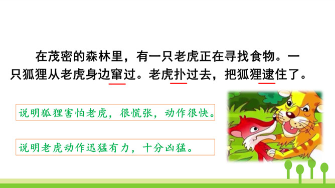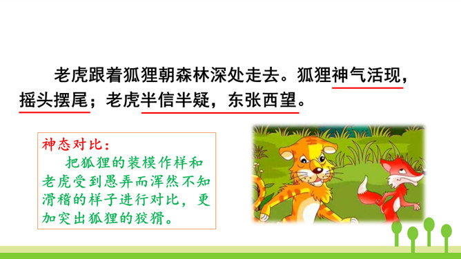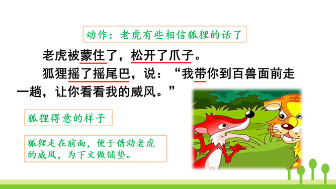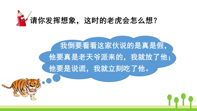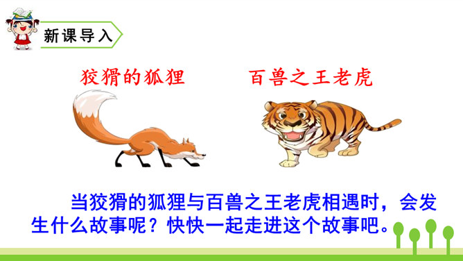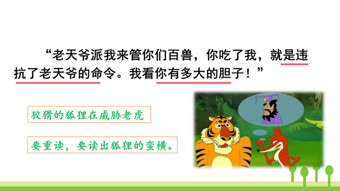 当狡猾的狐狸与百兽之王老虎相遇时,会发生什么故事呢?快快一起走进这个故事吧。认真听课文朗读,边听边思考:1.课文讲了一个怎样的故事?2.这是一只怎样的狐狸,你是怎么知道的?读狐狸的话时,声调要高,要读出狐狸装腔作势、不可一世的语气。读老虎的话时,语气要重,要读出老虎吃惊而摸不着头脑的感觉。请你发挥想象,这时的老虎会怎么想?我倒要看看这家伙说的是真是假,他要真是老天爷派来的,我就放了他;他要是说谎,我就立刻吃了他。所属专题:狐假虎威ppt。