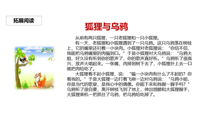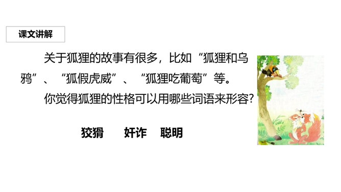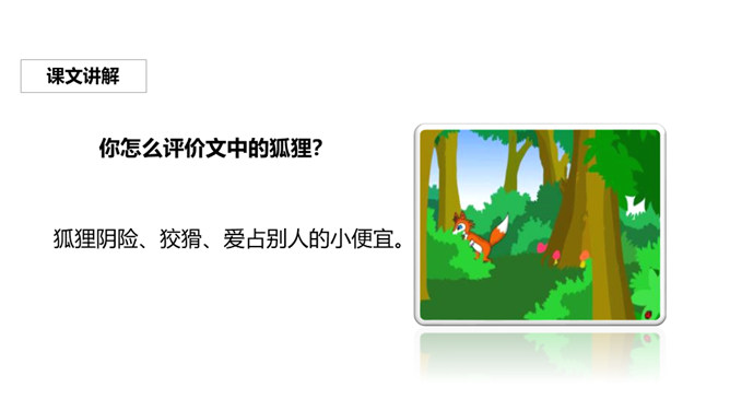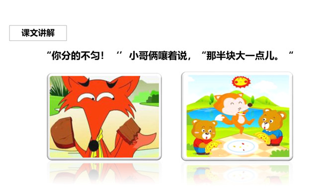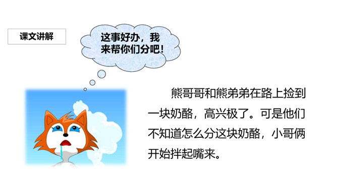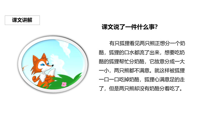 关于狐狸的故事有很多,比如“狐狸和乌鸦”、“狐假虎威”、“狐狸吃葡萄”等。你觉得狐狸的性格可以用哪些词语来形容?课文说了一件什么事?有只狐狸看见两只熊正想分一个奶酪,狐狸的口水都流了出来,想要吃奶酪的狐狸帮忙分奶酪,它故意分成一大一小,两只熊都不满意。就这样被狐狸一口一口吃掉奶酪,狐狸心满意足的走了,但是两只熊却没有奶酪分着吃了。你怎么评价文中的狐狸?狐狸阴险、狡猾、爱占别人的小便宜。所属专题:狐狸分奶酪ppt。