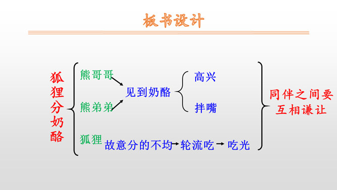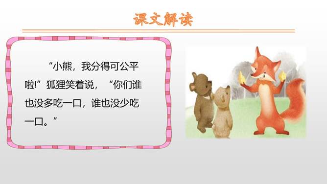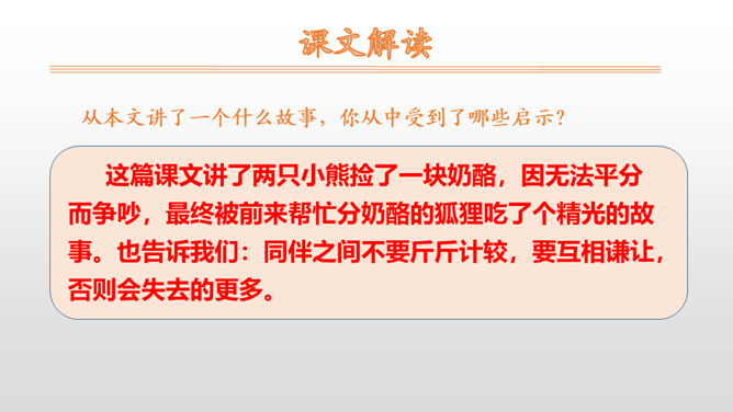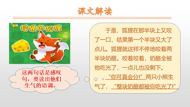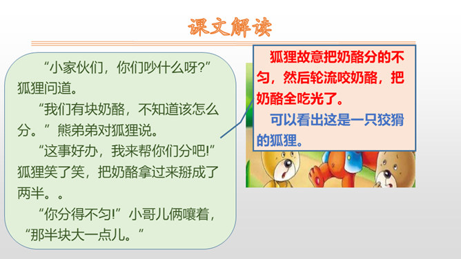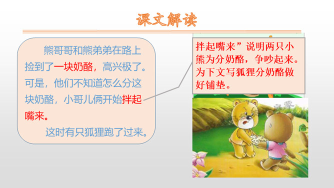 拌起嘴来”说明两只小熊为分奶酪,争吵起来。为下文写狐狸分奶酪做好铺垫。狐狸故意把奶酪分的不匀,然后轮流咬奶酪,把奶酪全吃光了。可以看出这是一只狡猾的狐狸。从本文讲了一个什么故事,你从中受到了哪些启示?这篇课文讲了两只小熊捡了一块奶酪,因无法平分而争吵,最终被前来帮忙分奶酪的狐狸吃了个精光的故事。也告诉我们:同伴之间不要斤斤计较,要互相谦让,否则会失去的更多。所属专题:狐狸分奶酪ppt。