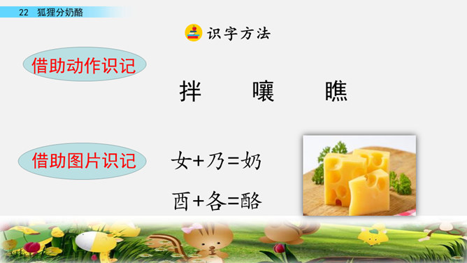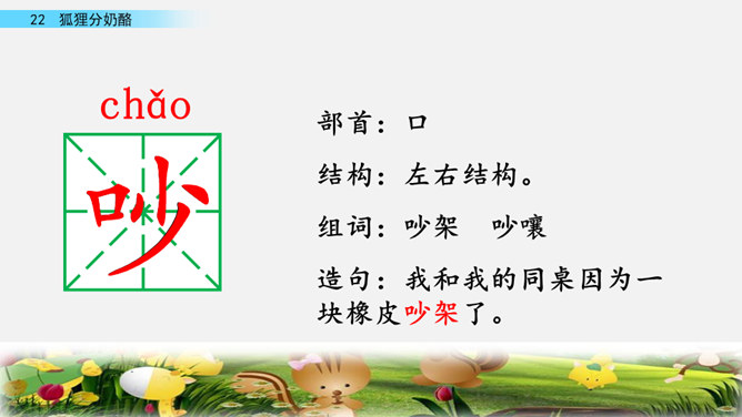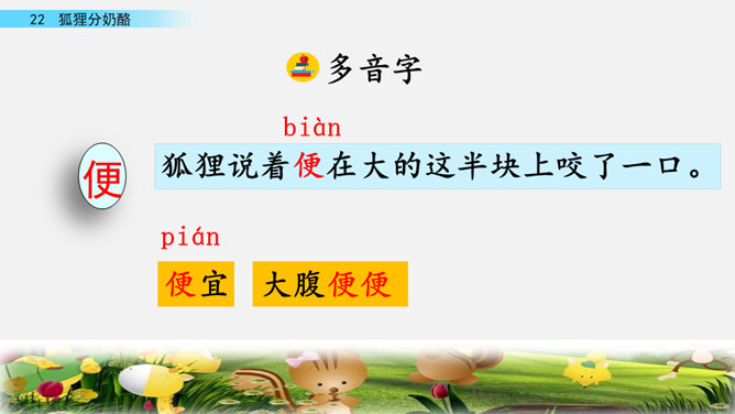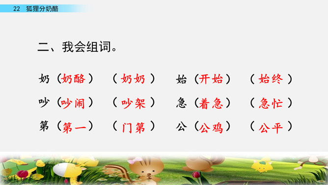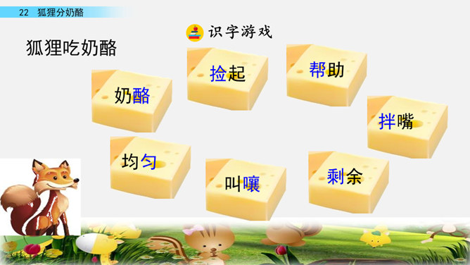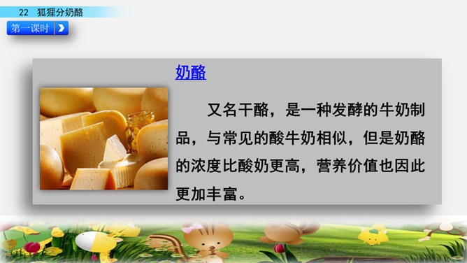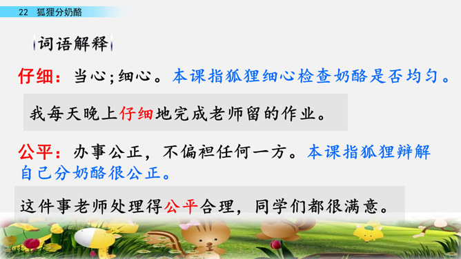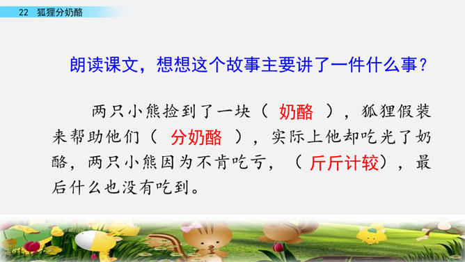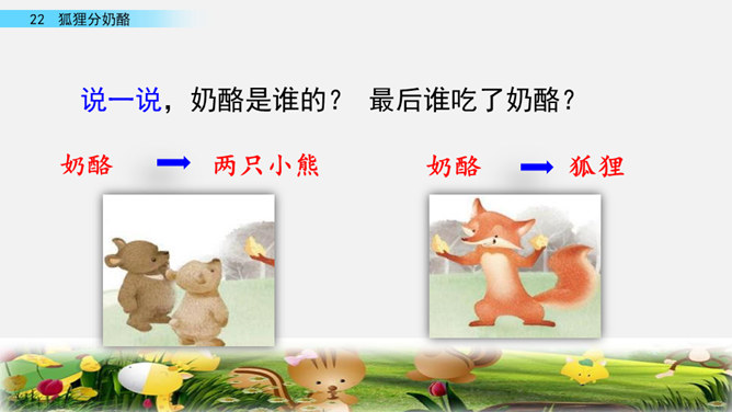 快速读课文,说一说课文讲述了一件什么事。讲述了狐狸给两只小熊分奶酪,两只小熊什么也没有吃到,狐狸却把整个奶酪吃光的故事。讲述了狐狸给两只小熊分奶酪,两只小熊什么也没有吃到,狐狸却把整个奶酪吃光的故事。我曾经因为我的朋友不小心摔坏了我心爱的画笔而和他拌嘴,不过后来我们和好了,因为我明白了他并不是故意的。开火车读第2-4自然段,看一看谁出现了,用横线画出他说的话,再用虚线画出熊弟弟的话。所属专题:狐狸分奶酪ppt。