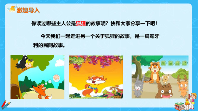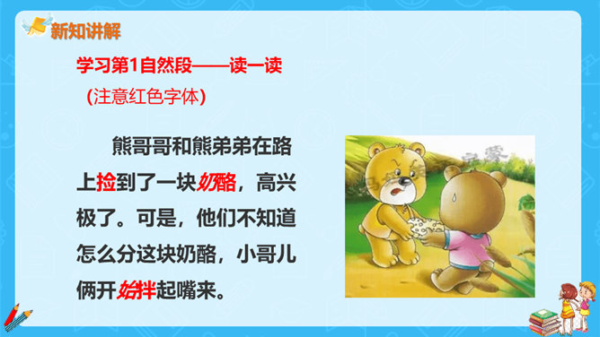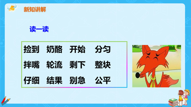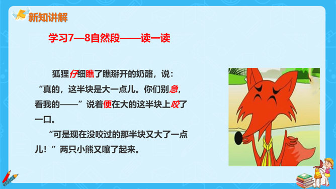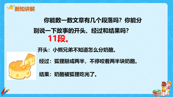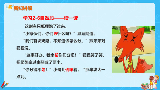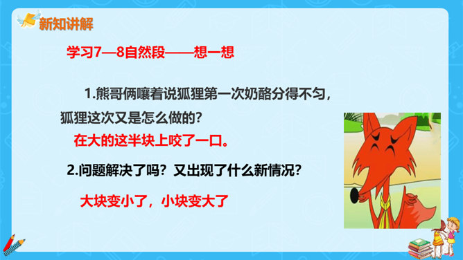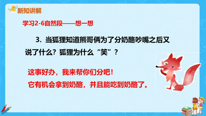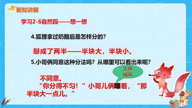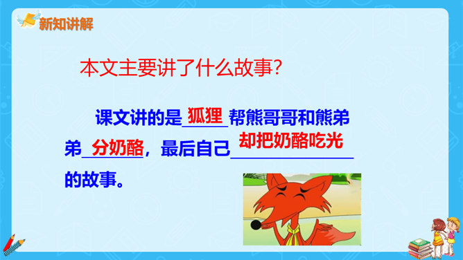 狐狸说,他分得很公平,谁也没多吃一口,谁也没少吃一口。你同意狐狸的说法吗?如果你是小熊,会怎么做?不同意。奶酪是两只小熊的,它们两个谁也没吃到,反而是狐狸把奶酪全部吃掉了。如果我是小熊,我不会去计较谁比谁多一点。我们要自己分,不让狐狸插手。狐狸分奶酪的故事启示我们:要有团队信任,要相信自己的队友,过分斤斤计较反而失去的更多。与自己的小伙伴不应该内讧,要一致对外,不能让敌人钻了空子。相信自己的敌人,不相信队友的人最后只能让敌人抢夺自己的成果。所属专题:狐狸分奶酪ppt。