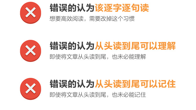 《如何高效阅读》读书笔记PPT。阅读的三个错误:错误的认为该逐字逐句读、错误的认为从头读到尾可以理解、错误的认为从头读到尾可以记住。