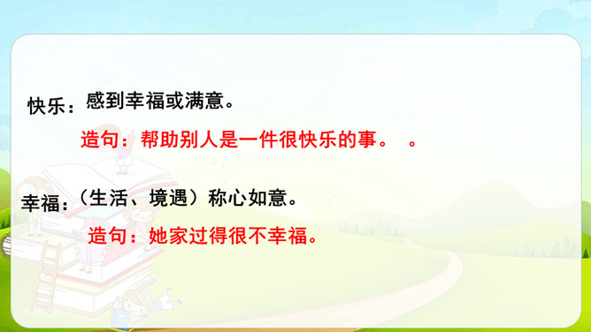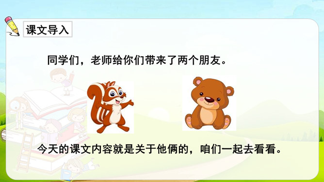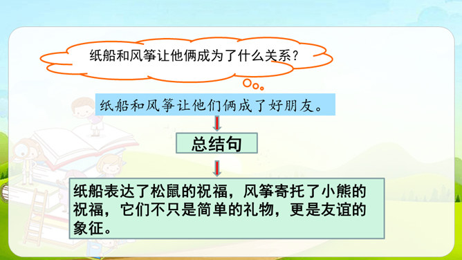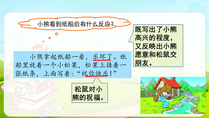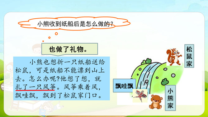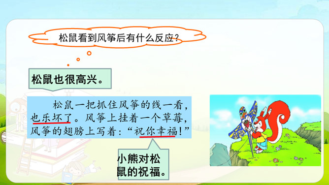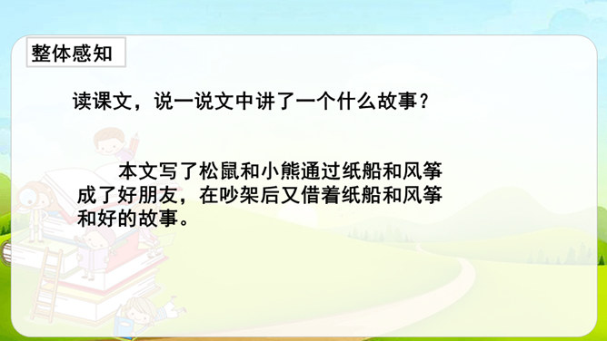 本文通过叙述松鼠和小熊成为好朋友的经过及有矛盾后又重归于好的事,赞扬了他们的真诚友谊。这个故事告诉我们:人与人交往需要建立友谊,而友谊还需要不断地维护。同学们可以在将课文读正确读通顺的基础上来进行默读。默读时,要注意两点:一是集中注意力,二是不出声。猜猜下面加点的字的读音,和同学交流你是怎么猜出来的?说说你用这些方法还认识了哪些字。所属专题:纸船和风筝ppt。