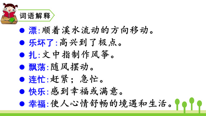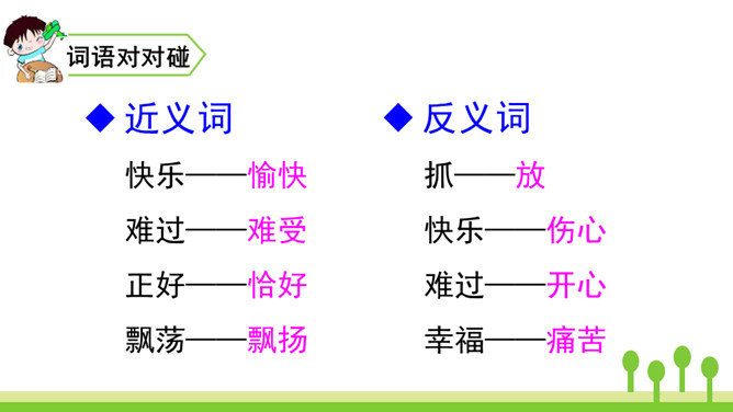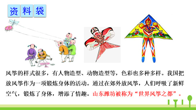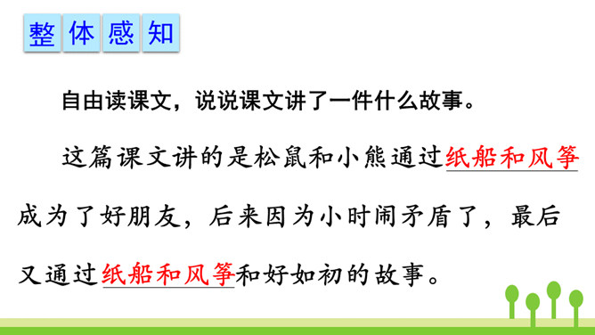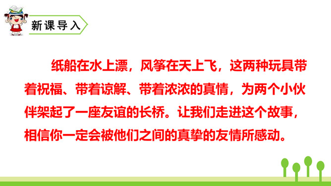 纸船在水上漂,风筝在天上飞,这两种玩具带着祝福、带着谅解、带着浓浓的真情,为两个小伙伴架起了一座友谊的长桥。让我们走进这个故事,相信你一定会被他们之间的真挚的友情所感动。 同学们,请大家认真听课文朗读,注意生字词的读音,边听边思考:每组中的两句话意思是一样的,但是在第1组中,第2个句子比第1个句子多了“漂哇漂”;第2组中,第2个句子比第1个句子多了“飘哇飘”。每组中第2个句子表达得都更具体、生动。所属专题:纸船和风筝ppt。
