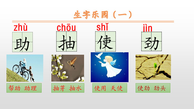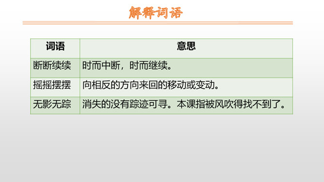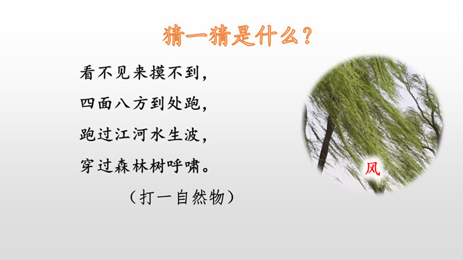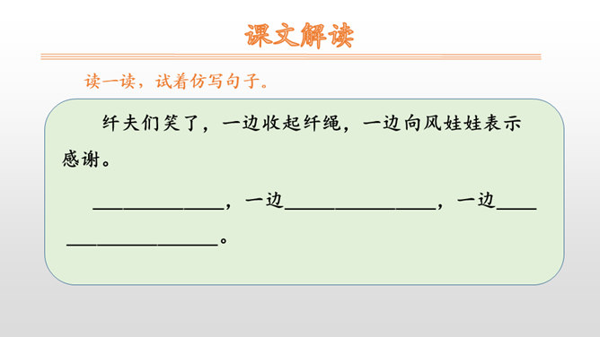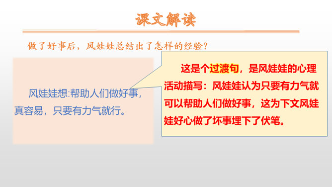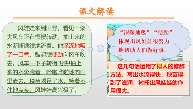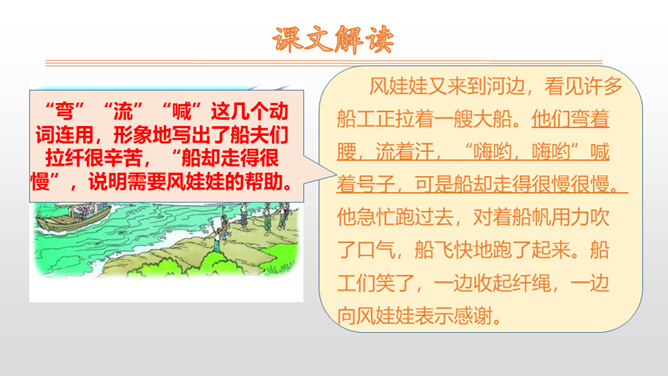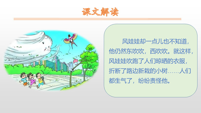 朗读课文。不认识的字先猜一猜,再和同学交流。思路提示:通过朗读,我们要体会风娃娃热情帮助人们却得到两种截然不同的结果时的心理。对风娃娃的描写应读出热情、高兴和疑惑的语气,突出他可爱、乐于助人却有些傻气的特点。根据下面的提示讲讲这个故事。参考答案:风娃娃来到田野,使劲地吹大风车,帮助人们灌溉田地。风娃娃来到河边,帮助船工用力地吹船帆,使船跑得飞快。风娃娃来到广场,用力地吹风筝,使风筝在空中摇摇摆摆,不一会儿,风筝被吹得无影无踪。所属专题:风娃娃ppt。