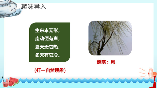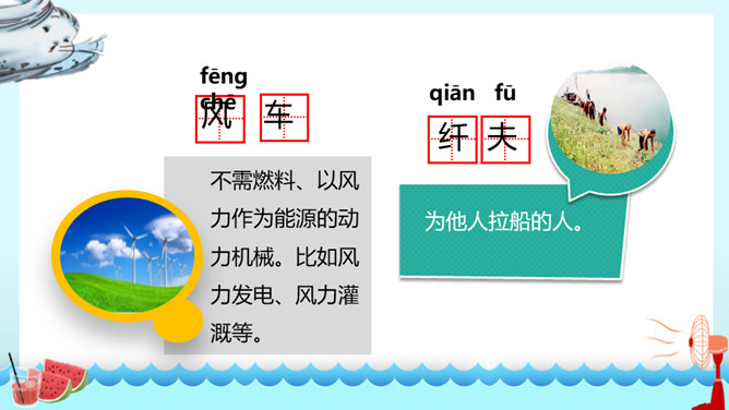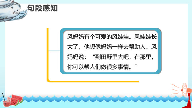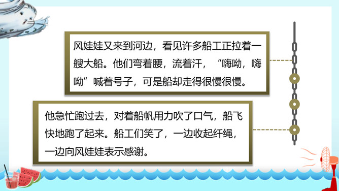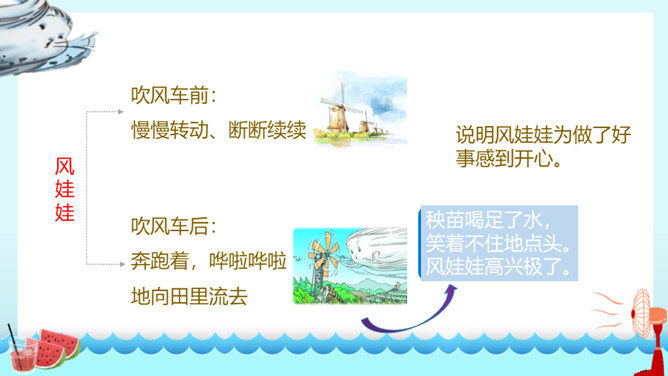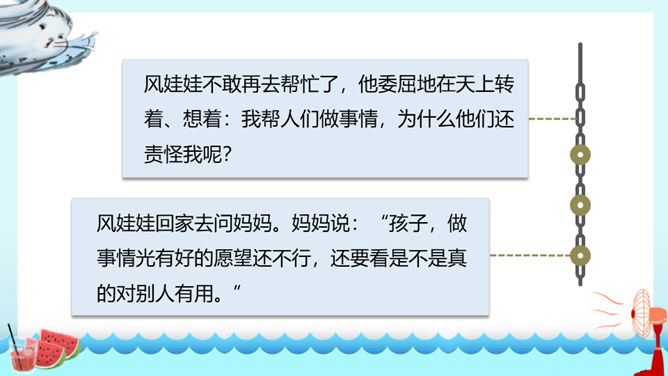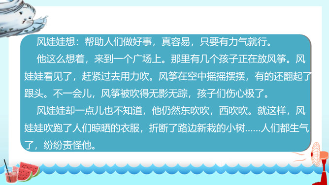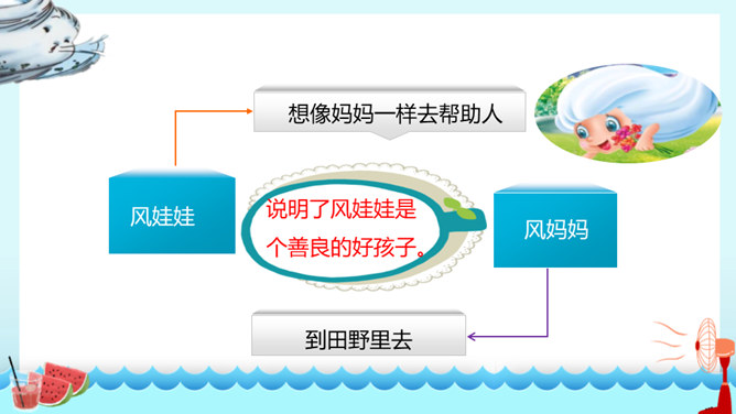 风娃娃想着帮人们做些好事,他来到田野,吹动了转得慢悠悠的风车,让禾苗喝足了水;他来到小河边,使劲吹船帆,让纤夫们省了力气,使船飞快地行驶,得到了人们的感谢。可是,他来到了广场上,仍然使劲吹孩子们的风筝、吹人们晒的衣服、折断路边的小树,人们开始责怪风娃娃。风娃娃不知道该怎样做,最后妈妈告诉风娃娃:孩子,做事情光有好的愿望还不行,还要看是不是真的对别人有用。所属专题:风娃娃ppt。