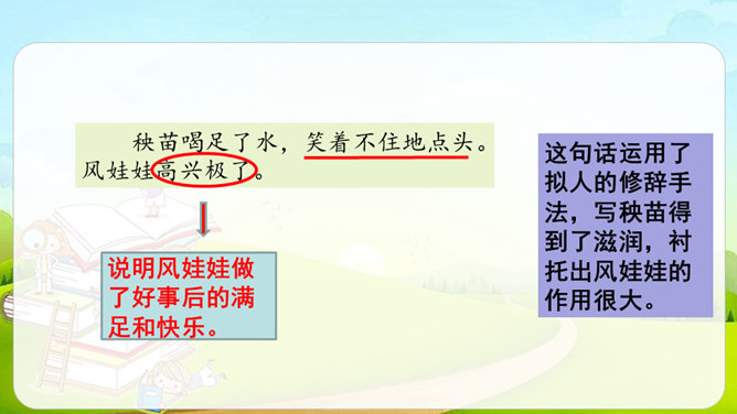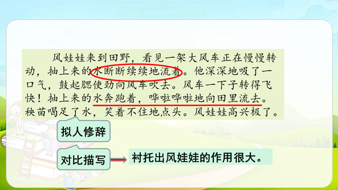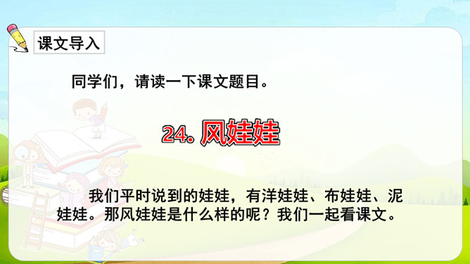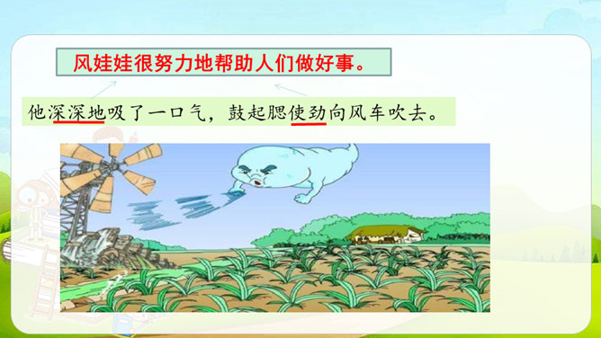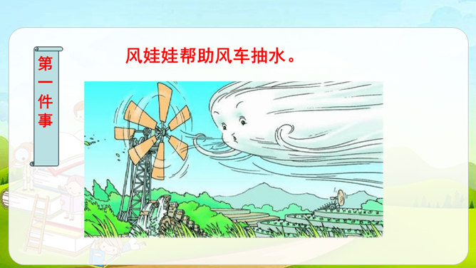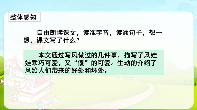 我们平时说到的娃娃,有洋娃娃、布娃娃、泥娃娃。那风娃娃是什么样的呢?我们一起看课文。自由朗读课文,读准字音,读通句子,想一想,课文写了什么?本文通过写风做过的几件事,描写了风娃娃乖巧可爱,又“傻”的可爱。生动的介绍了风给人们带来的好处和坏处。认真读课文第1自然段,思考:故事的起因是什么?自由读课文第2—4自然段,思考:风娃娃来到田野做了哪些事?它做的怎么样?所属专题:风娃娃ppt。