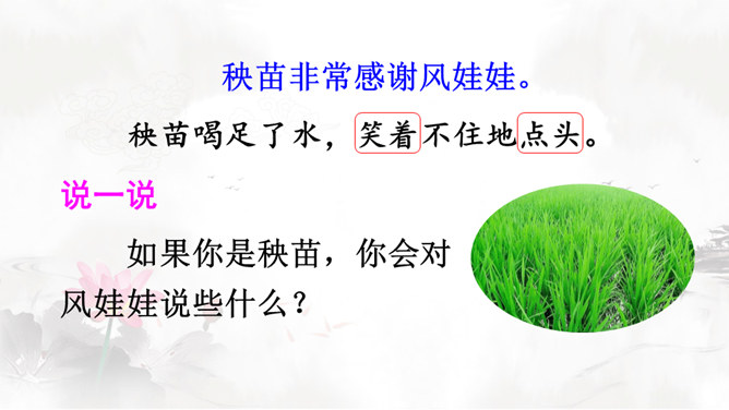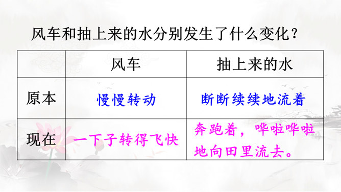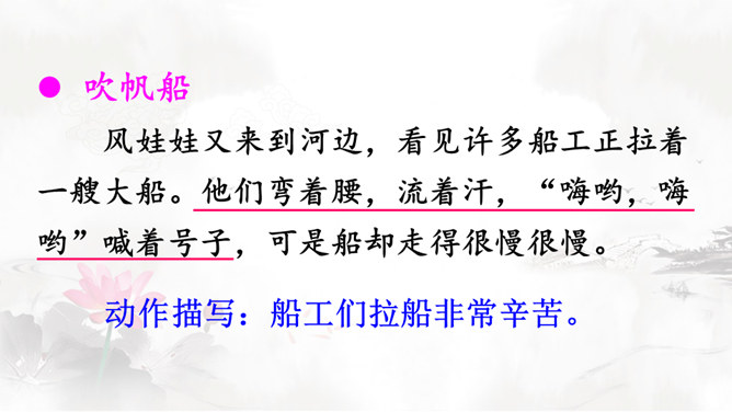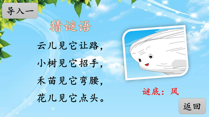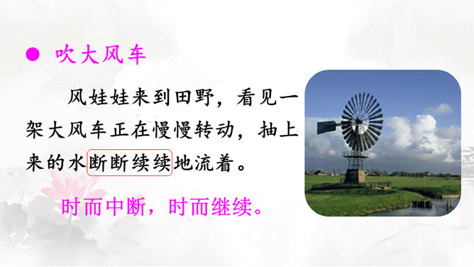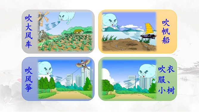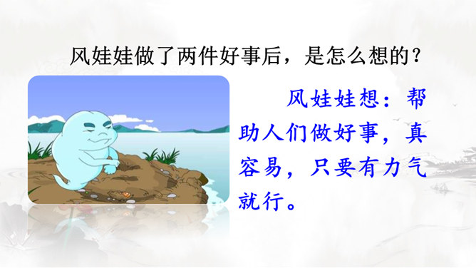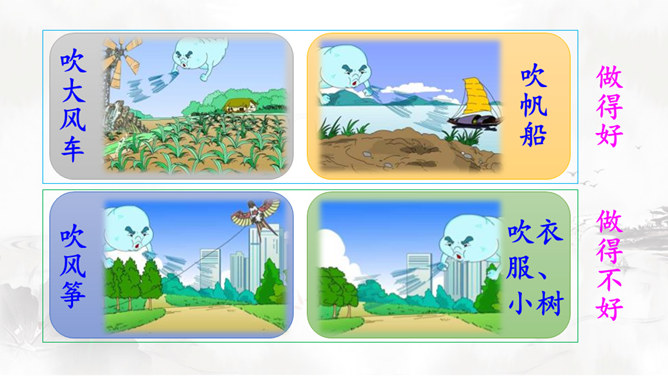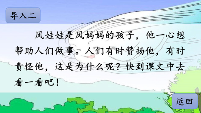 风娃娃是风妈妈的孩子,他一心想帮助人们做事。人们有时赞扬他,有时责怪他,这是为什么呢?快到课文中去看一看吧!认真读课文,画出生字词,难读的句子多读几遍,试着把课文读通顺。自由朗读课文,边读边思考:风娃娃为人们做了哪些事?这些事中哪些做得好,哪些做得不好?风娃娃不敢再去帮忙了,他委屈地在天上转着、想着:我帮人们做事情,为什么他们还责怪我呢?风妈妈是如何教育风孩子的?所属专题:风娃娃ppt。