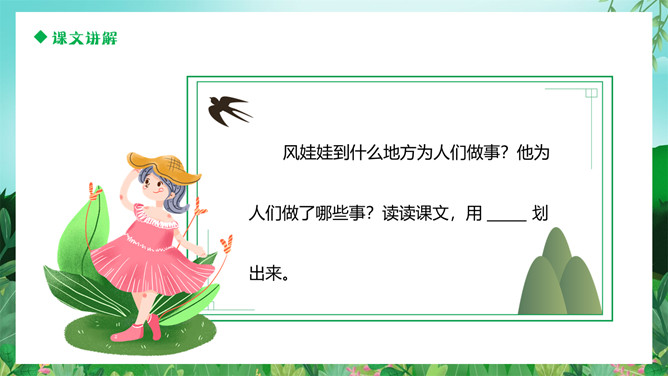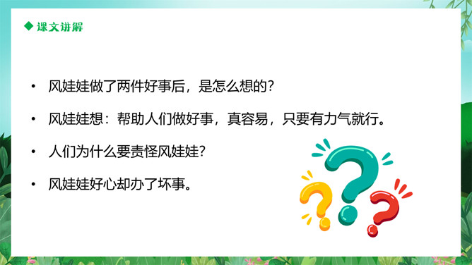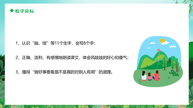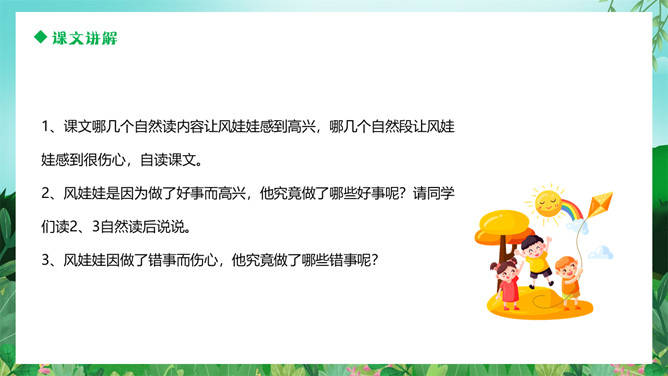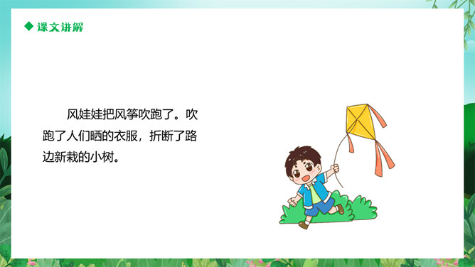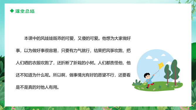 1、认识“抽、续”等11个生字,会写8个字;2、正确、流利、有感情地朗读课文,体会风娃娃的好心和傻气;3、懂得“做好事要看是不是真的对别人有用”的道理。1、课文哪几个自然读内容让风娃娃感到高兴,哪几个自然段让风娃娃感到很伤心,自读课文。2、风娃娃是因为做了好事而高兴,他究竟做了哪些好事呢?请同学们读2、3自然读后说说。3、风娃娃因做了错事而伤心,他究竟做了哪些错事呢?所属专题:风娃娃ppt。
