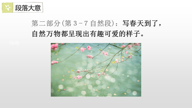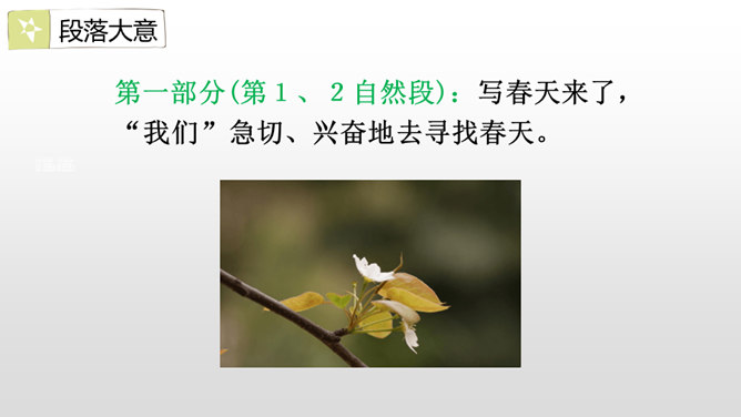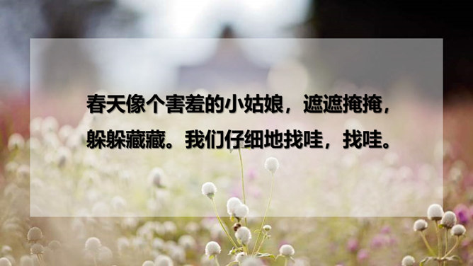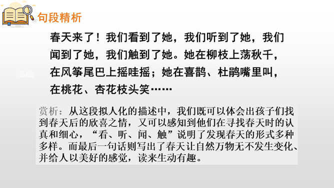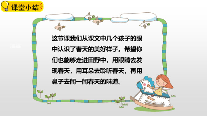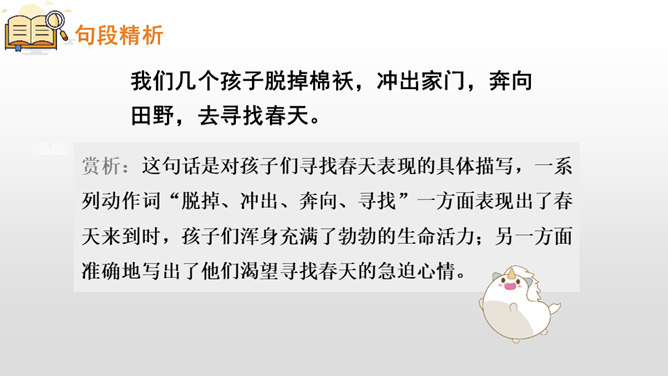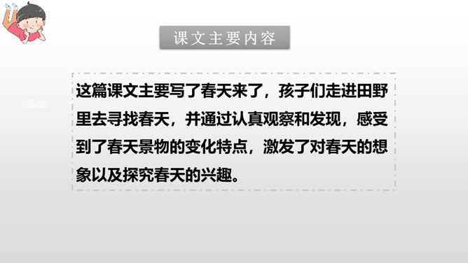 这篇课文主要写了春天来了,孩子们走进田野里去寻找春天,并通过认真观察和发现,感受到了春天景物的变化特点,激发了对春天的想象以及探究春天的兴趣。这句话是对孩子们寻找春天表现的具体描写,一系列动作词“脱掉、冲出、奔向、寻找”一方面表现出了春天来到时,孩子们浑身充满了勃勃的生命活力;另一方面准确地写出了他们渴望寻找春天的急迫心情。这节课我们从课文中几个孩子的眼中认识了春天的美好样子。希望你们也能够走进田野中,用眼睛去发现春天,用耳朵去聆听春天,再用鼻子去闻一闻春天的味道。所属专题:找春天ppt。