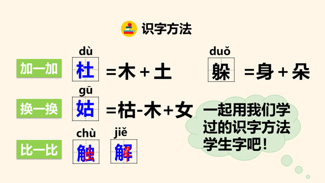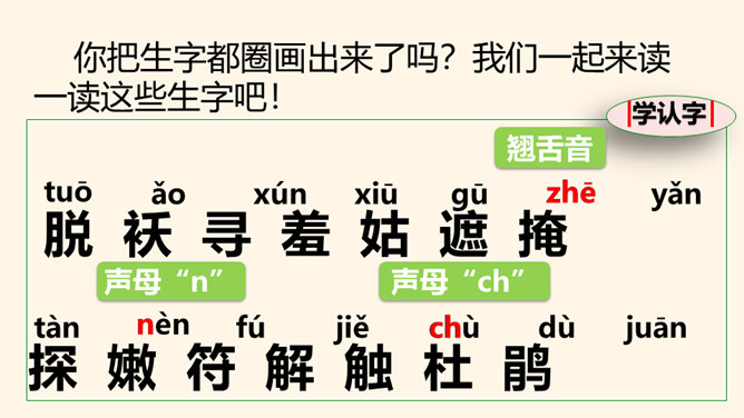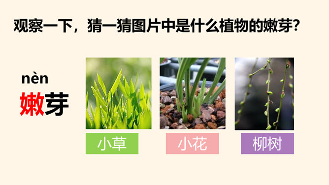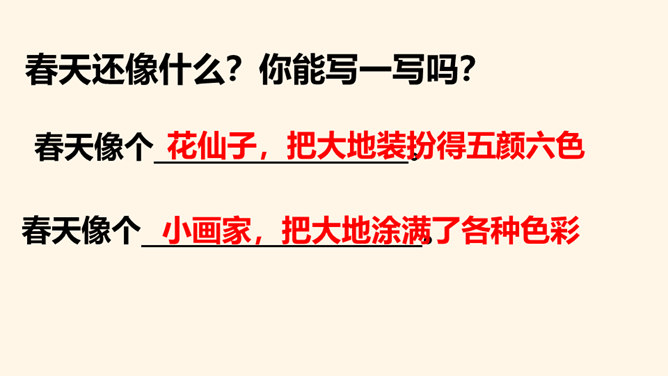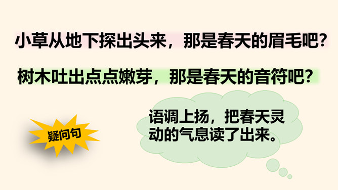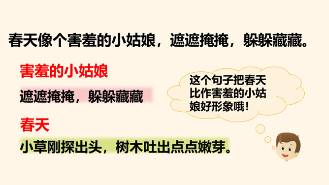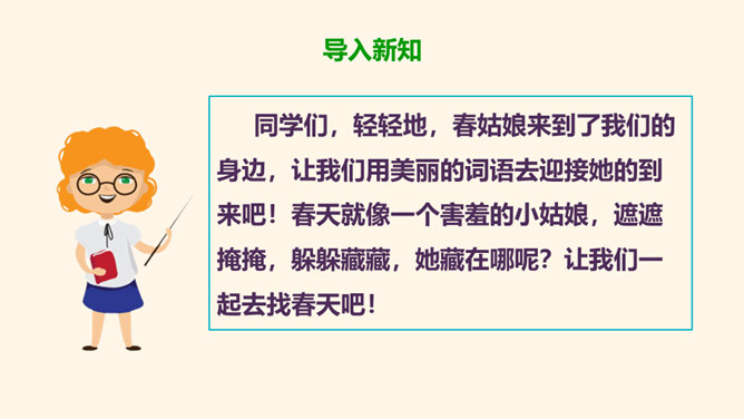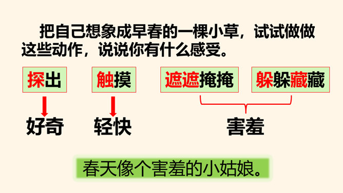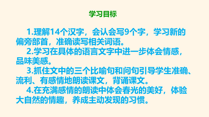 1.理解14个汉字,会认会写9个字,学习新的偏旁部首,准确读写相关词语。2.学习在具体的语言文字中进一步体会情感,品味美感。3.抓住文中的三个比喻句和问句引导学生准确、流利、有感情地朗读课文,背诵课文。4.在充满感情的朗读中体会春光的美好,体验大自然的情趣,养成主动发现的习惯。同学们,轻轻地,春姑娘来到了我们的身边,让我们用美丽的词语去迎接她的到来吧!春天就像一个害羞的小姑娘,遮遮掩掩,躲躲藏藏,她藏在哪呢?让我们一起去找春天吧!所属专题:找春天ppt。