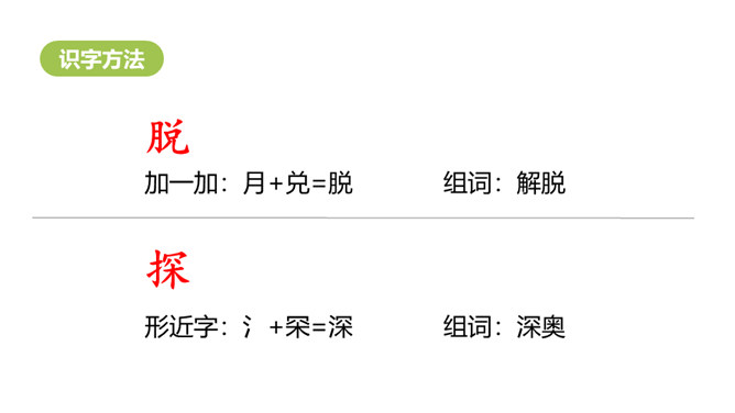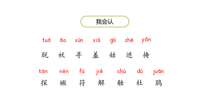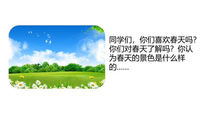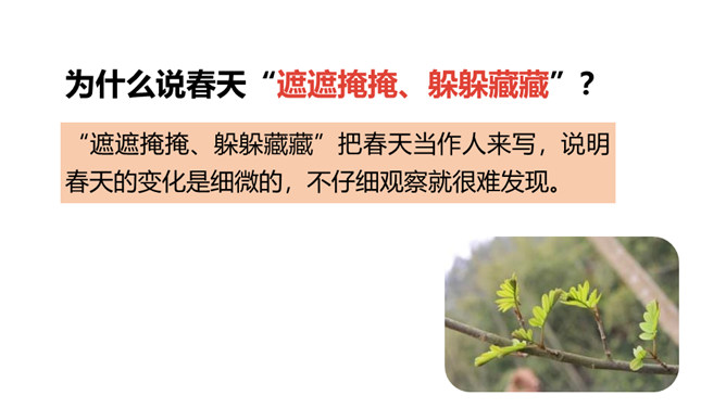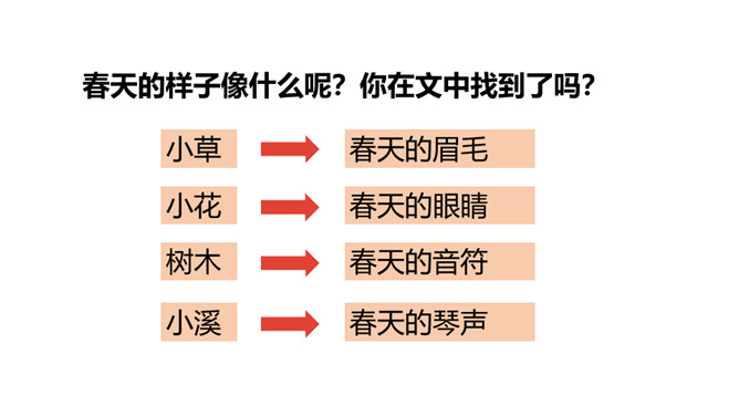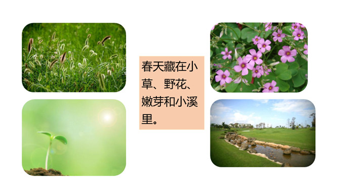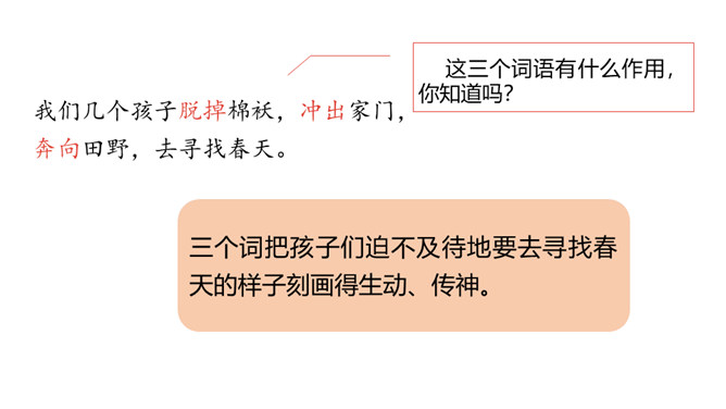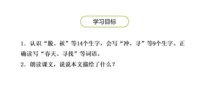 1.认识“脱、袄”等14个生字,会写“冲、寻”等9个生字。正确读写“春天、寻找”等词语。2.朗读课文,说说本文描绘了什么?同学们,你们喜欢春天吗?你们对春天了解吗?你认为春天的景色是什么样的……初读课文,想一想课文写了几部分内容?从哪些方面描写了“春天来了”?正确流利地朗读课文,能注意语气和情感。 能说出文中孩子们找到的春天是什么样的。遮遮掩掩、躲躲藏藏”把春天当作人来写,说明春天的变化是细微的,不仔细观察就很难发现。所属专题:找春天ppt。
