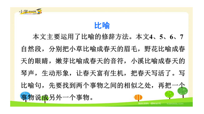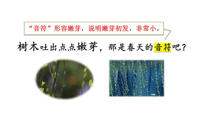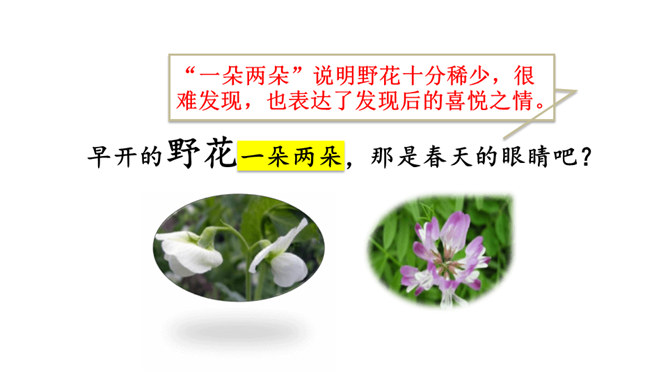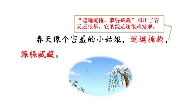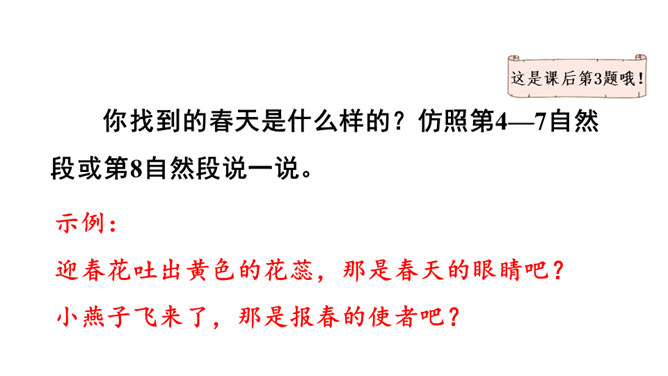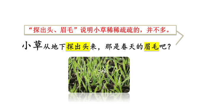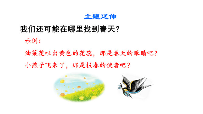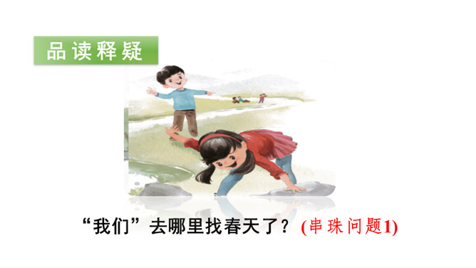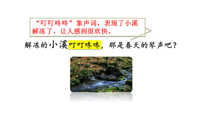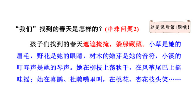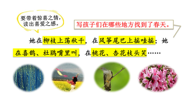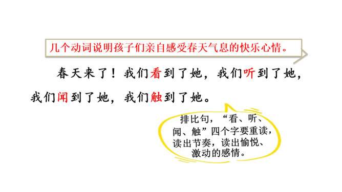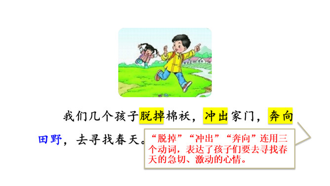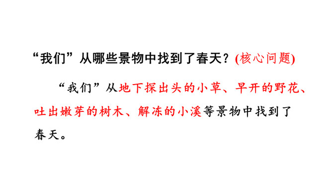 让我们用摘苹果的方法来复习一下上节课认识的生字宝宝吧!“脱掉”“冲出”“奔向”连用三个动词,表达了孩子们要去寻找春天的急切、激动的心情。“我们”从哪些景物中找到了春天?(核心问题)“我们”从地下探出头的小草、早开的野花、吐出嫩芽的树木、解冻的小溪等景物中找到了春天。你找到的春天是什么样的?仿照第4—7自然段或第8自然段说一说。“我们”是如何感受到春天的?(串珠问题3)所属专题:找春天ppt。