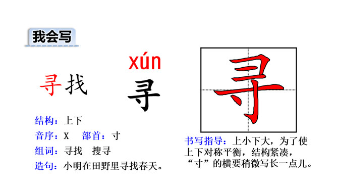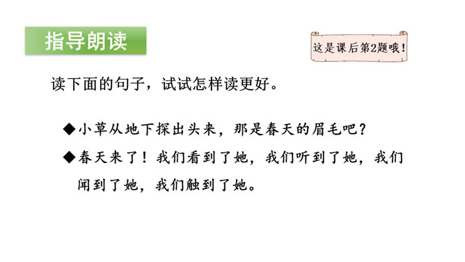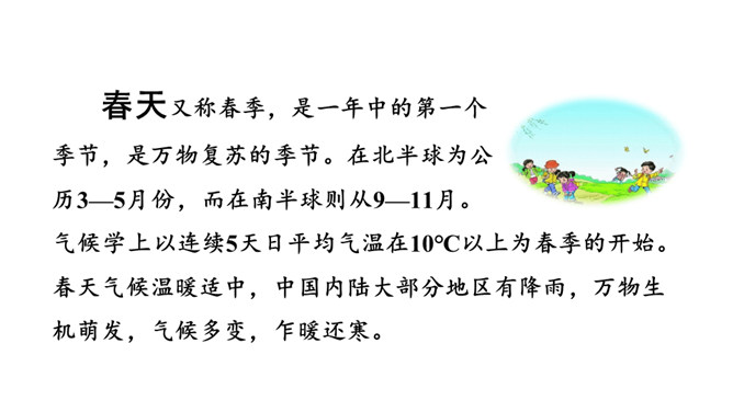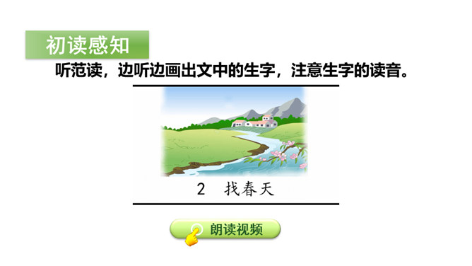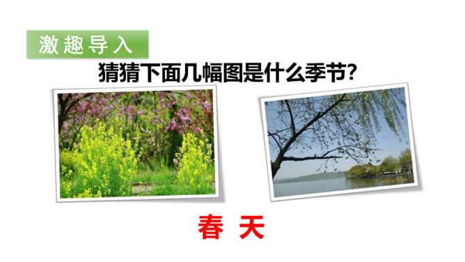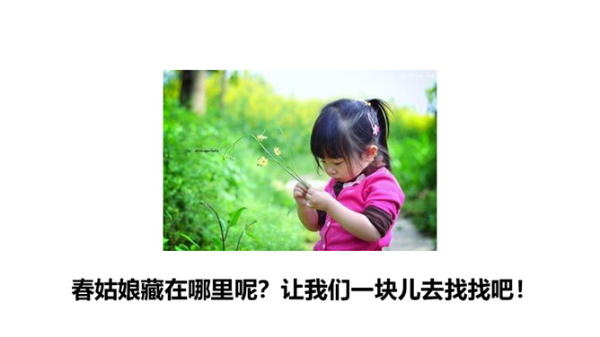 猜猜下面几幅图是什么季节?春姑娘藏在哪里呢?让我们一块儿去找找吧!听范读,边听边画出文中的生字,注意生字的读音。读下面的句子,试试怎样读更好。小草从地下探出头来,那是春天的眉毛吧?疑问句,朗读时,要读出孩子的天真、读出疑问的语气。排比句,“看、听、闻、触”四个字要重读,读出节奏,读出愉悦、激动的感情。初读课文后,你感受到了什么?初读课文后,我感受到了小朋友寻找春天的喜悦心情,春天的无限美好。所属专题:找春天ppt。