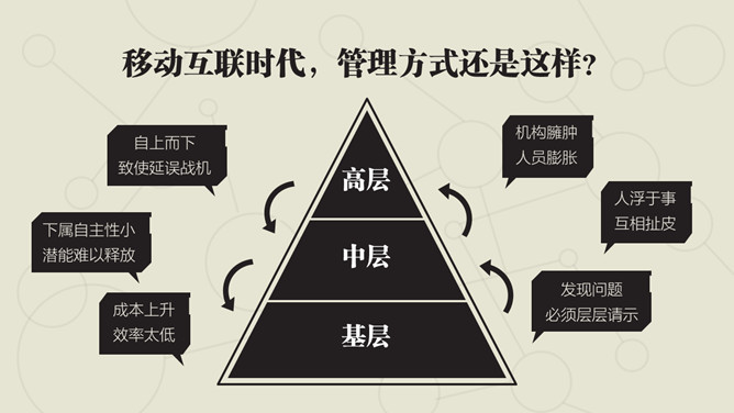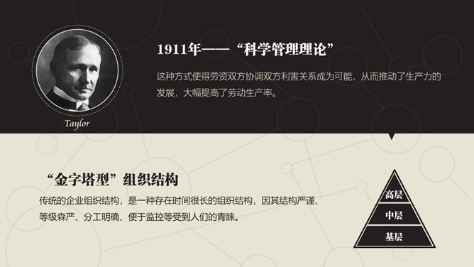 《同级管理》读书笔记PPT。“科学管理理论”这种方式使得劳资双方协调双方利害关系成为可能,从而推动了生产力的发展,大幅提高了劳动生产率。传统的企业组织结构,是一种存在时间很长的组织结构,因其结构严谨、等级森严、分工明确、便于监控等受到人们的青睐。
