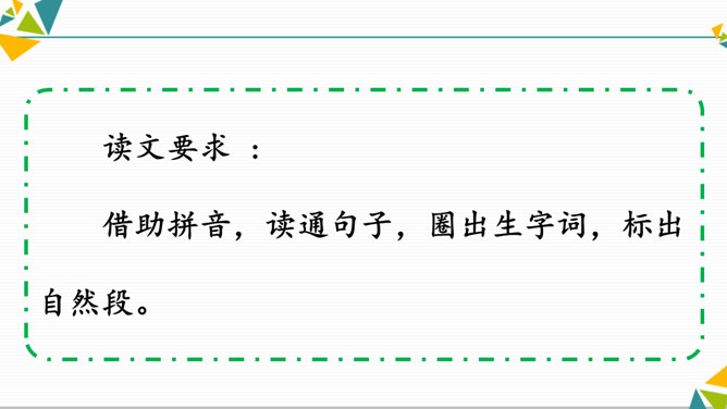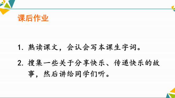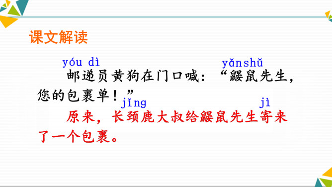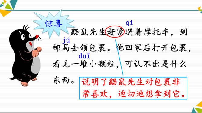读文要求 :借助拼音,读通句子,圈出生字词,标出自然段。读课文,找出不认识的字词,多读几遍。自由朗读课文,边读边找,课文中共出现了哪几种动物。再读课文,想一想:鼹鼠先生得到有包裹的通知后,它的心情怎样?课后作业:熟读课文,会认会写本课生字词。搜集一些关于分享快乐、传递快乐的故事,然后讲给同学们听。所属专题:开满鲜花的小路ppt。