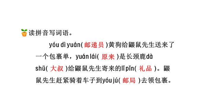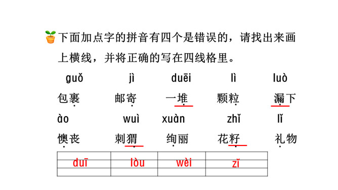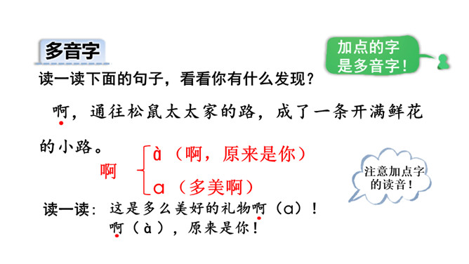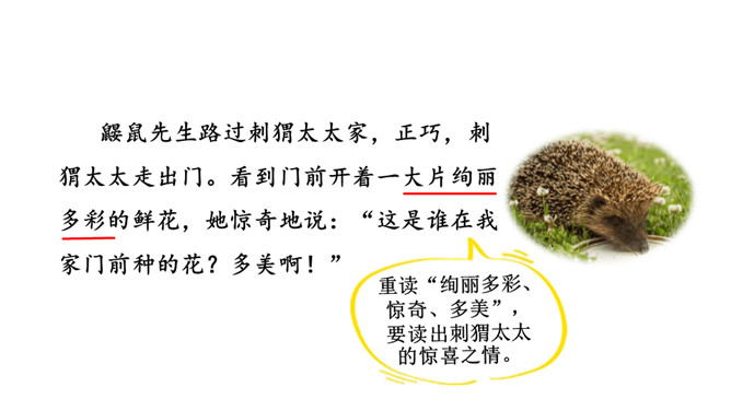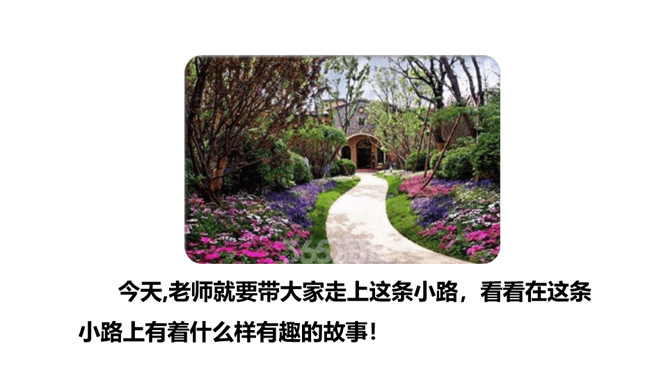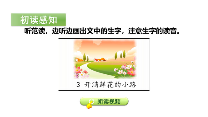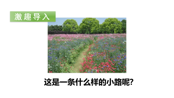 今天,老师就要带大家走上这条小路,看看在这条小路上有着什么样有趣的故事!听范读,边听边画出文中的生字,注意生字的读音。下面加点字的拼音有四个是错误的,请找出来画上横线,并将正确的写在四线格里。1.分角色朗读课文;2.读一读,演一演;3.全班评一评:哪一个小组读得好?初读课文后,你感受到了什么?示例:初读课文后,我感受到了小动物之间和谐相处的美好情感。读一读下面的句子,看看你有什么发现?所属专题:开满鲜花的小路ppt。