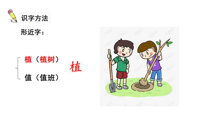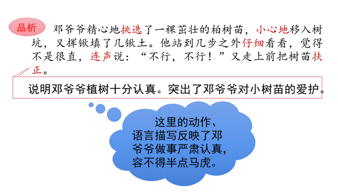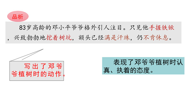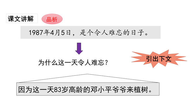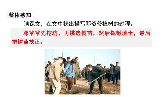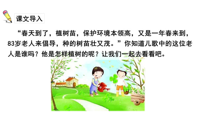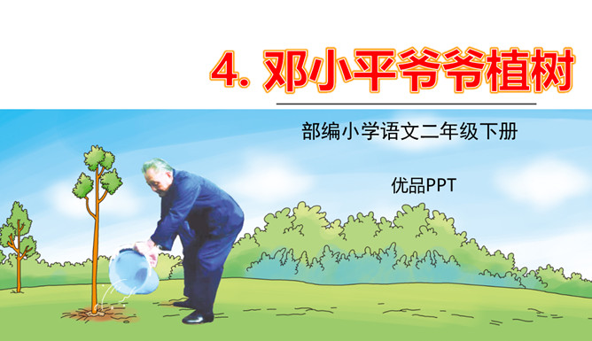 “春天到了,植树苗,保护环境本领高,又是一年春来到,83岁老人来倡导,种的树苗壮又茂。”你知道儿歌中的这位老人是谁吗?他是怎样植树的呢?让我们一起去看看吧。读课文,在文中找出描写邓爷爷植树的过程。展现出生机勃勃的样子。表明邓爷爷高兴的心情。课文记述了1987年4月5日,邓小平爷爷在北京天坛公园种下一棵柏树的过程,表现了邓小平爷爷做事严谨认真的态度以及对植树绿化的重视。所属专题:邓小平爷爷植树ppt。