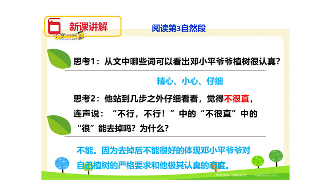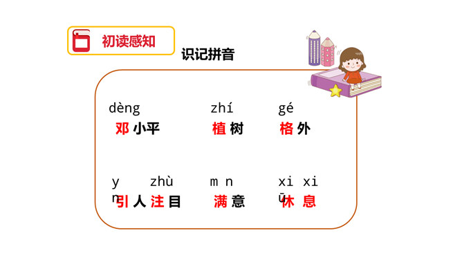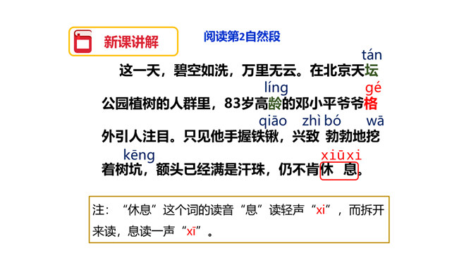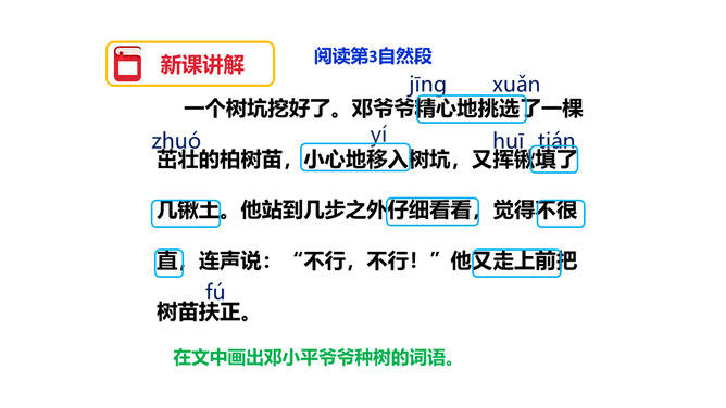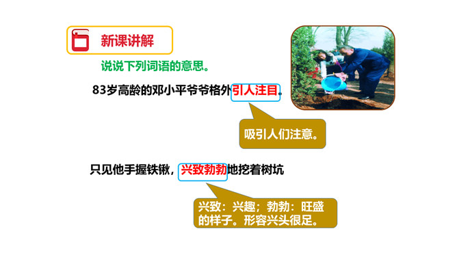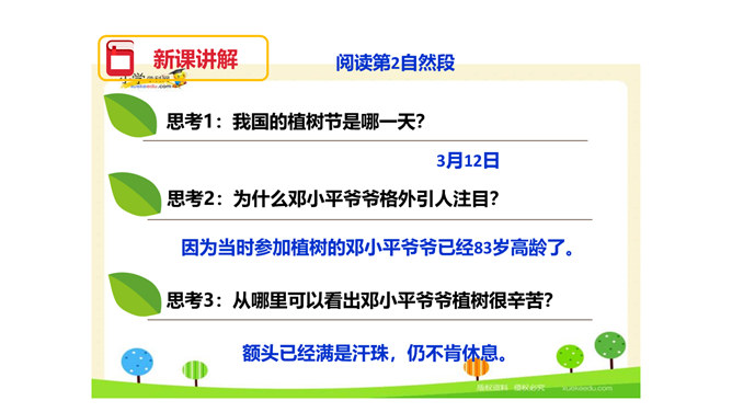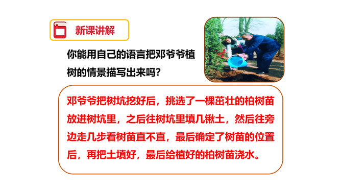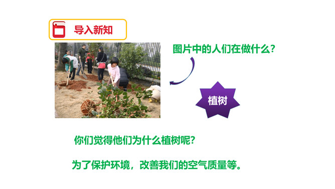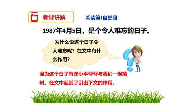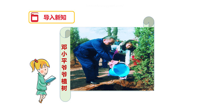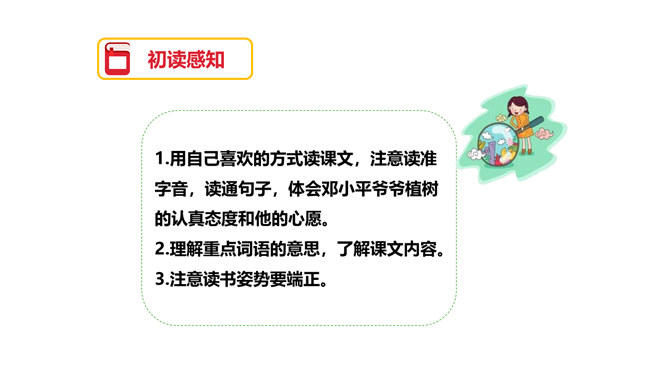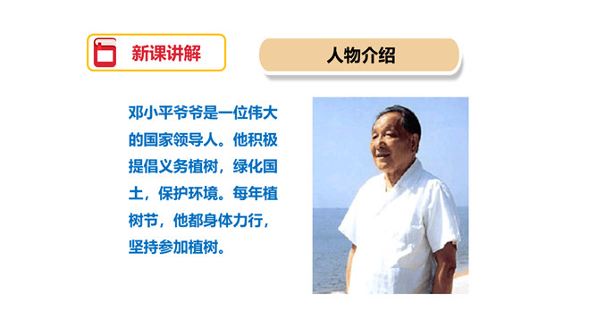 图片中的人们在做什么?你们觉得他们为什么植树呢?为了保护环境,改善我们的空气质量等。1.用自己喜欢的方式读课文,注意读准字音,读通句子,体会邓小平爷爷植树的认真态度和他的心愿。2.理解重点词语的意思,了解课文内容。3.注意读书姿势要端正。为什么说这个日子令人难忘呢?在文中有什么作用?因为这个日子有邓小平爷爷与我们一起植树。在文中起到了引出下文的作用。我国的植树节是哪一天?所属专题:邓小平爷爷植树ppt。