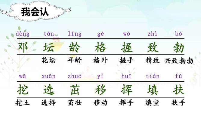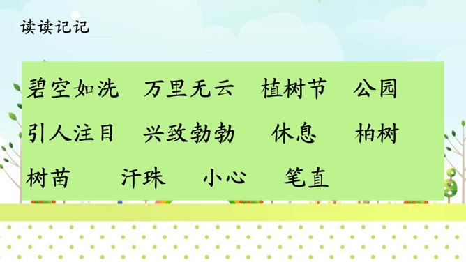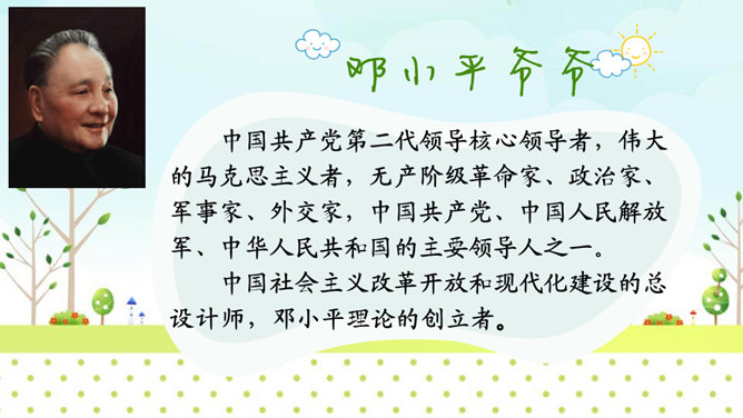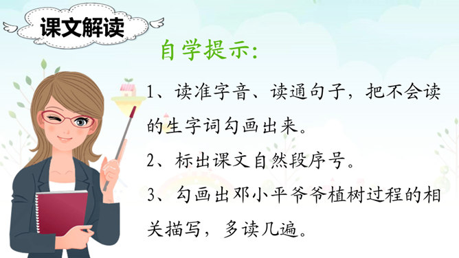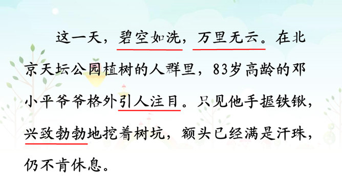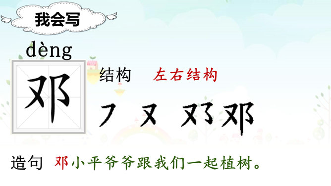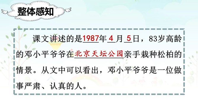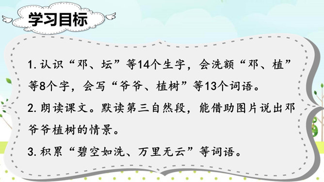 自学提示:1、读准字音、读通句子,把不会读的生字词勾画出来。2、标出课文自然段序号。3、勾画出邓小平爷爷植树过程的相关描写,多读几遍。1.认识“邓、坛”等14个生字,会洗额“邓、植”等8个字,会写“爷爷、植树”等13个词语。2.朗读课文。默读第三自然段,能借助图片说出邓爷爷植树的情景。3.积累“碧空如洗、万里无云”等词语。看图说话:看着右边的插图,根据第三自然段的内容,说一说邓小平爷爷植树的情景。所属专题:邓小平爷爷植树ppt。