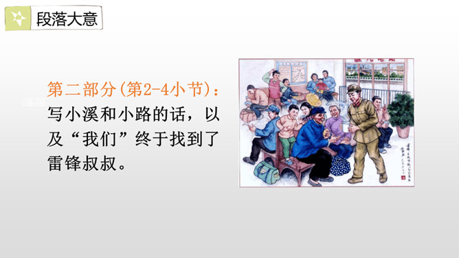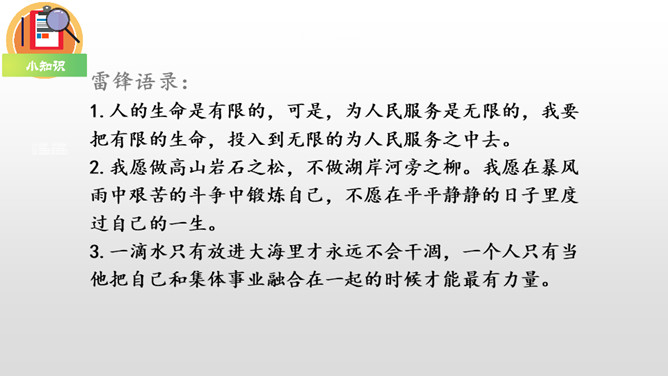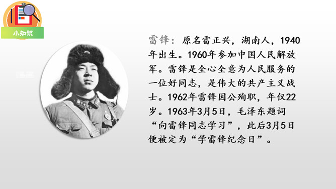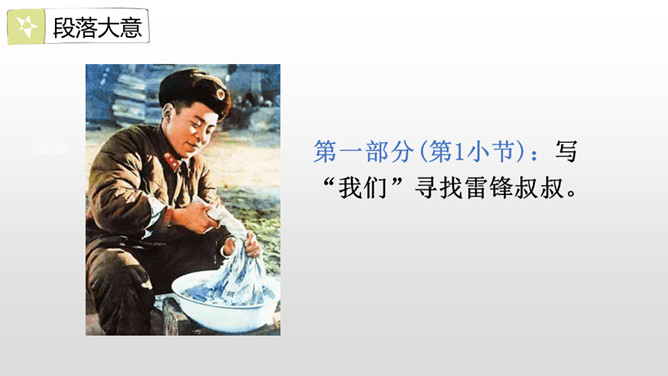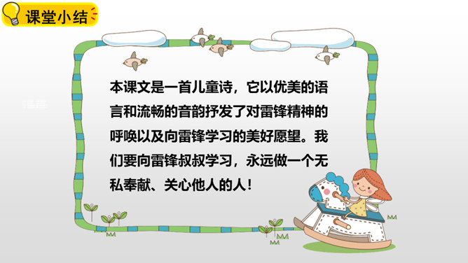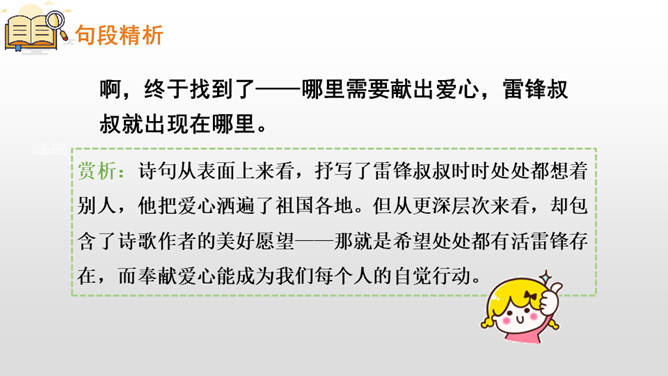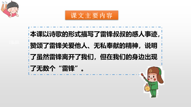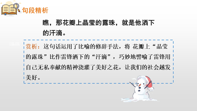 本课以诗歌的形式描写了雷锋叔叔的感人事迹,赞颂了雷锋关爱他人、无私奉献的精神,说明了虽然雷锋离开了我们,但在我们的身边出现了无数个“雷锋”。赏析:这句话运用了比喻的修辞手法,将 花瓣上“晶莹的露珠”比作雷锋洒下的“汗滴”,巧妙地譬喻了雷锋用自己无私奉献的精神浇灌了美好之花,让我们的社会越发美好。赏析:诗句从表面上来看,抒写了雷锋叔叔时时处处都想着别人,他把爱心洒遍了祖国各地。所属专题:雷锋叔叔你在哪里ppt。