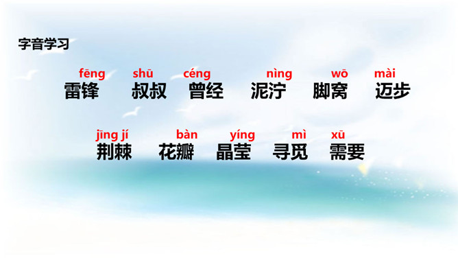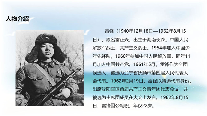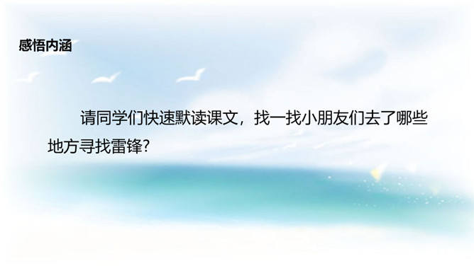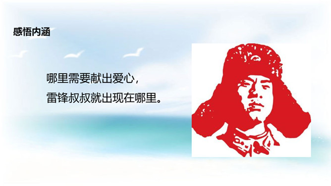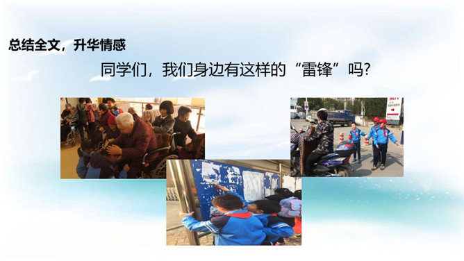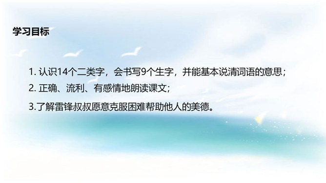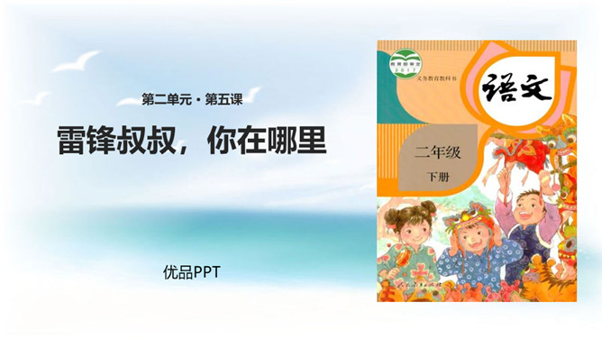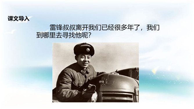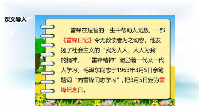 学习目标:1. 认识14个二类字,会书写9个生字,并能基本说清词语的意思;2. 正确、流利、有感情地朗读课文;3.了解雷锋叔叔愿意克服困难帮助他人的美德。同学们,你们喜欢唱歌吗?会唱《学习雷锋好榜样》吗?雷锋在短暂的一生中帮助人无数,一部《雷锋日记》令无数读者为之动容,他发扬了社会主义的“我为人人,人人为我”的精神,“雷锋精神”激励着一代又一代人学习,毛泽东同志于1963年3月5日亲笔题词“向雷锋同志学习”, 把3月5日定为雷锋纪念日。所属专题:雷锋叔叔你在哪里ppt。