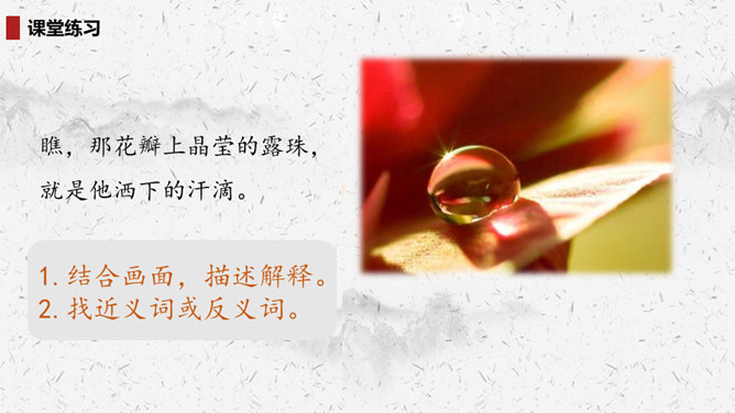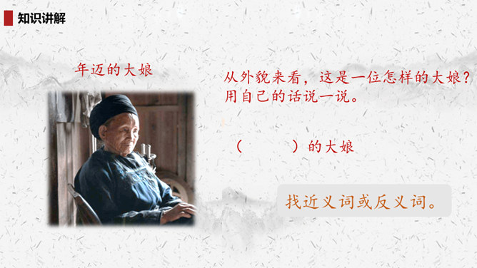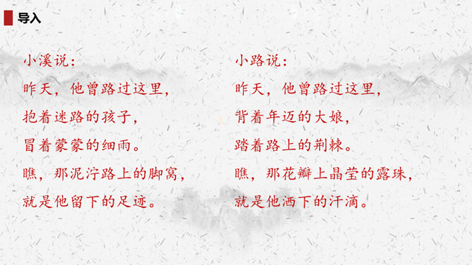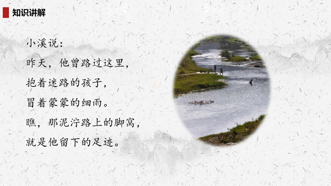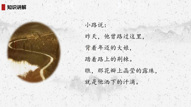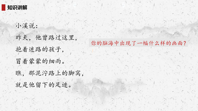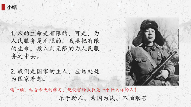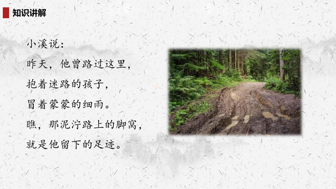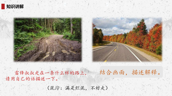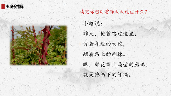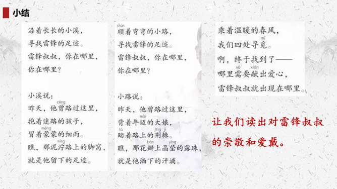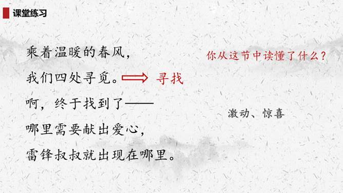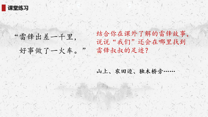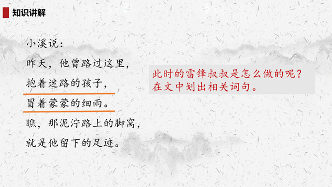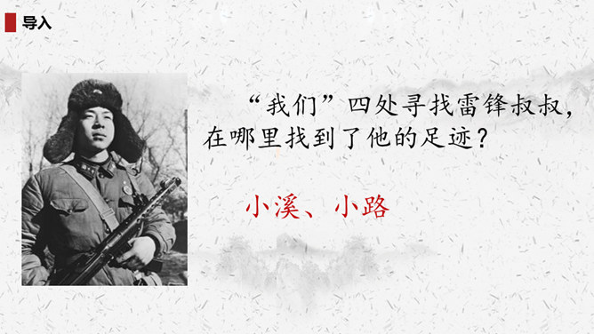 “我们”四处寻找雷锋叔叔,在哪里找到了他的足迹?你的脑海中出现了一幅什么样的画面?此时的雷锋叔叔是怎么做的呢?在文中划出相关词句。雷锋叔叔走在一条什么样的路上,请用自己的话描述一下。从外貌来看,这是一位怎样的大娘?用自己的话说一说。读完你想对雷锋叔叔说些什么?1.结合画面,描述解释。2.找近义词或反义词。结合你在课外了解的雷锋故事,说说“我们”还会在哪里找到雷锋叔叔的足迹?所属专题:雷锋叔叔你在哪里ppt。