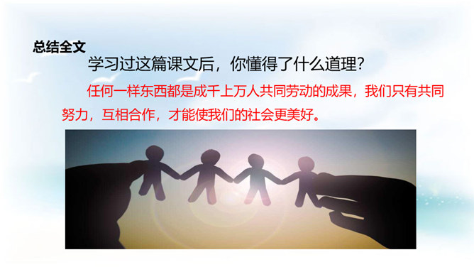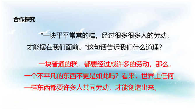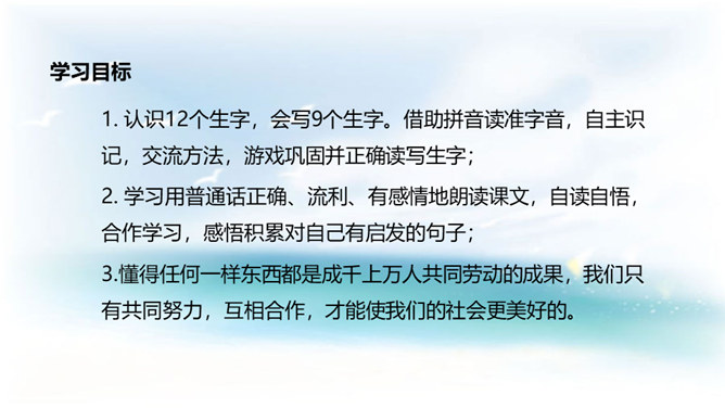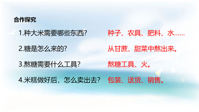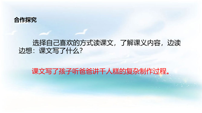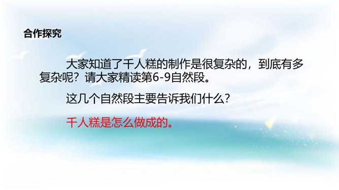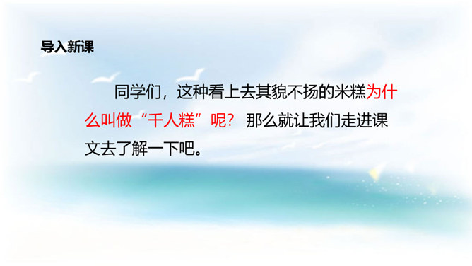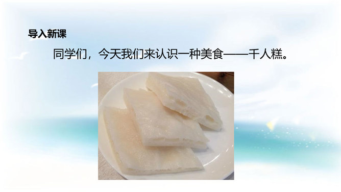 学习目标:1. 认识12个生字,会写9个生字。借助拼音读准字音,自主识记,交流方法,游戏巩固并正确读写生字;2. 学习用普通话正确、流利、有感情地朗读课文,自读自悟,合作学习,感悟积累对自己有启发的句子;3.懂得任何一样东西都是成千上万人共同劳动的成果,我们只有共同努力,互相合作,才能使我们的社会更美好的。同学们,这种看上去其貌不扬的米糕为什么叫做“千人糕”呢? 那么就让我们走进课文去了解一下吧。所属专题:千人糕ppt。