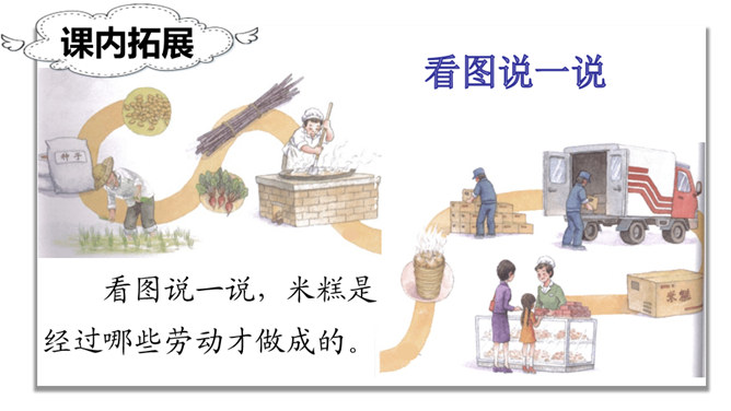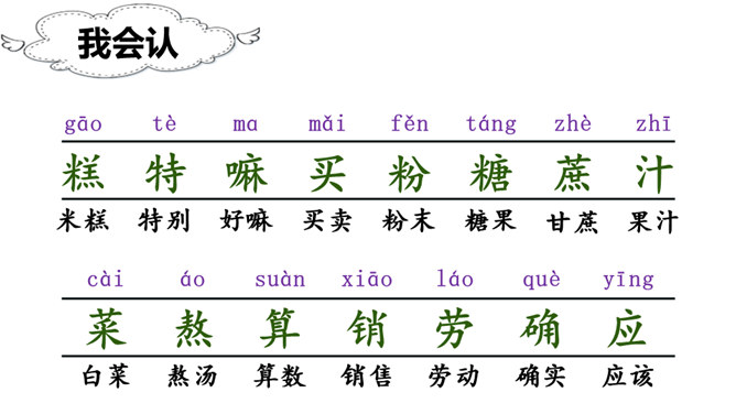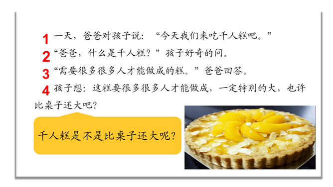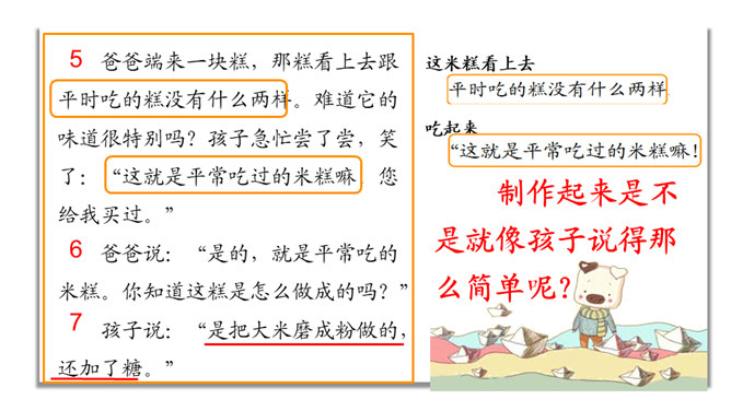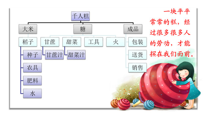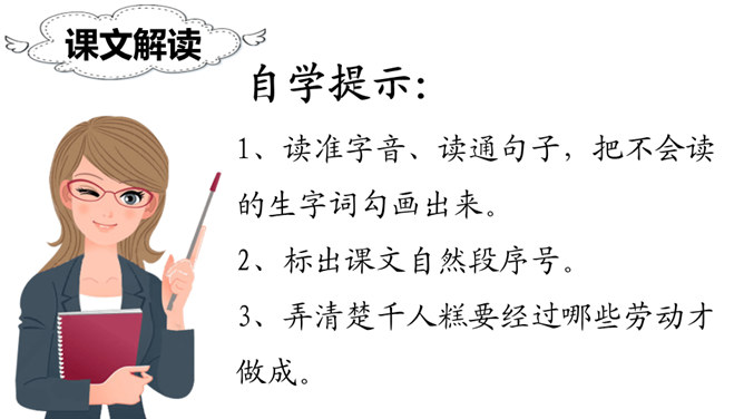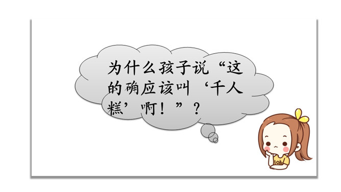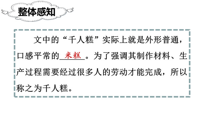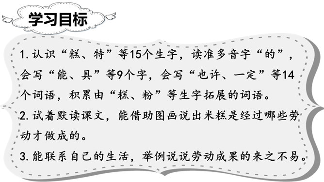 1.认识“糕、特”等15个生字,读准多音字“的”,会写“能、具”等9个字,会写“也许、一定”等14个词语,积累由“糕、粉”等生字拓展的词语。2.试着默读课文,能借助图画说出米糕是经过哪些劳动才做成的。3.能联系自己的生活,举例说说劳动成果的来之不易。文中的“千人糕”实际上就是外形普通,口感平常的米糕。为了强调其制作材料、生产过程需要经过很多人的劳动才能完成,所以称之为千人糕。所属专题:千人糕ppt。