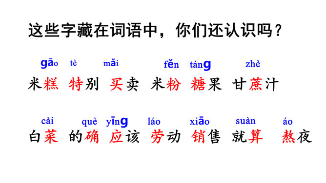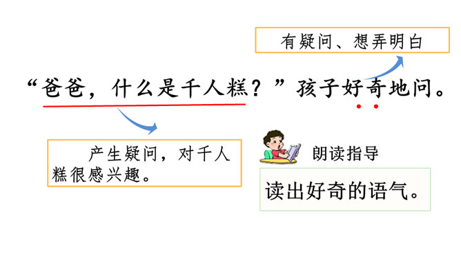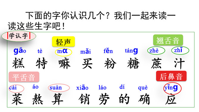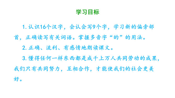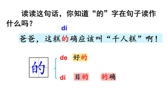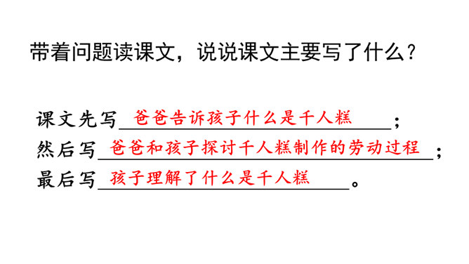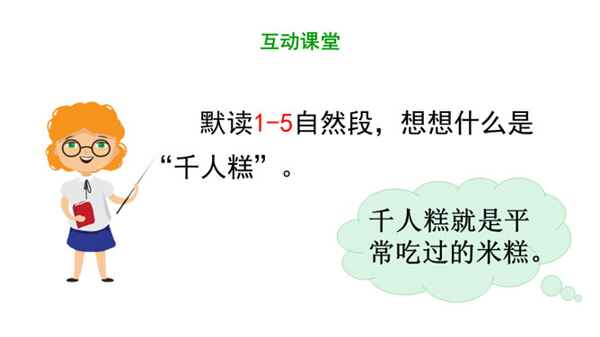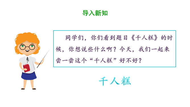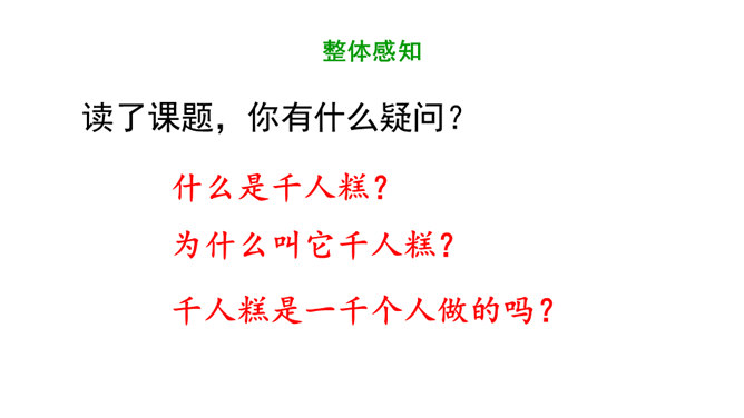 1.认识16个汉字,会认会写9个字,学习新的偏旁部首,正确读写有关词语。掌握多音字“的”的用法。2.正确、流利、有感情地朗读课文。3.懂得任何一样东西都是成千上万人共同劳动的成果,我们只有共同努力,互相合作,才能使我们的社会更美好。同学们,你们看到题目的时候,你想说些什么啊?今天,我们一起来尝一尝这个“千人糕”好不好?请同学们自由读课文,一边读,一边圈画出不认识的生字,借助拼音读准确。所属专题:千人糕ppt。