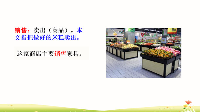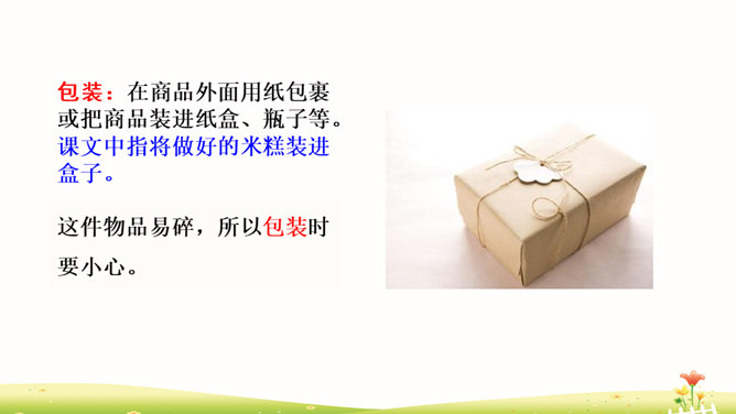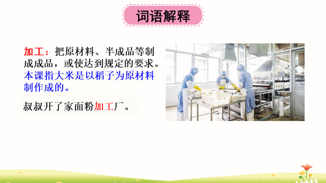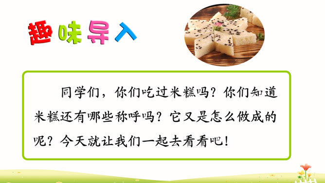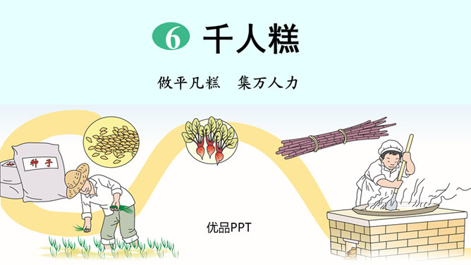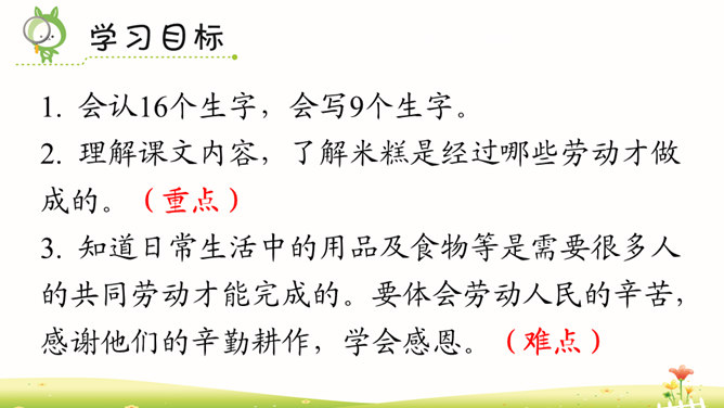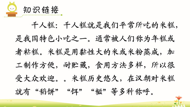 默读课文。借助插图,说说米糕是经过哪些劳动才做成的。米糕的主要原材料大米需要农民伯伯种植水稻,水稻的种植又需要种子、农具、肥料、水等。制作米糕所需要的糖是用甘蔗汁和甜菜汁熬出来的,甘蔗和甜菜又需要人种植,熬糖的时候要有工具、火等。米糕制成之后需要人包装、送货、销售。我们穿的衣服、用的文具等,都经过了很多人的劳动,举个例子说一说。本文讲的是爸爸给孩子讲“千人糕”是要经过很多人的劳动才摆在我们面前的。所属专题:千人糕ppt。