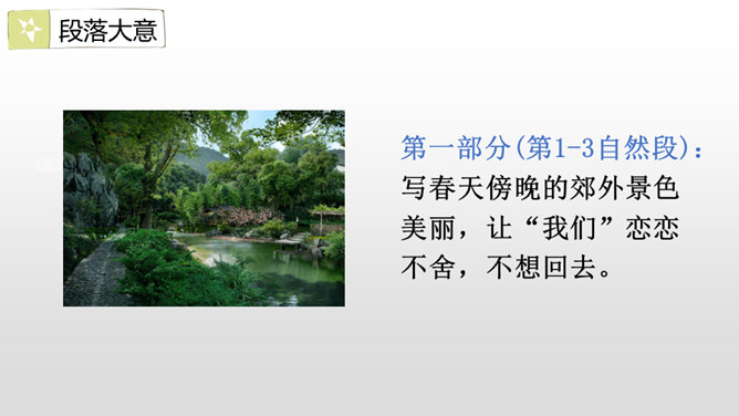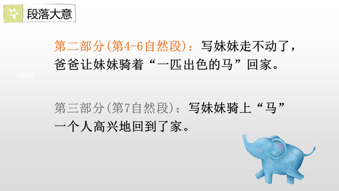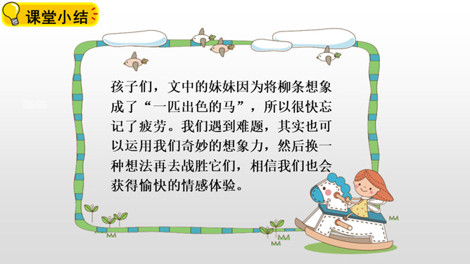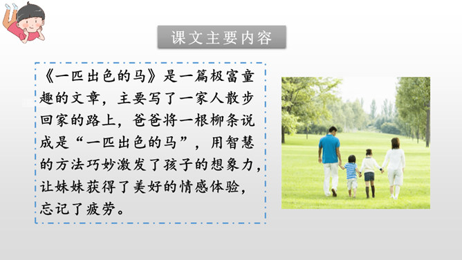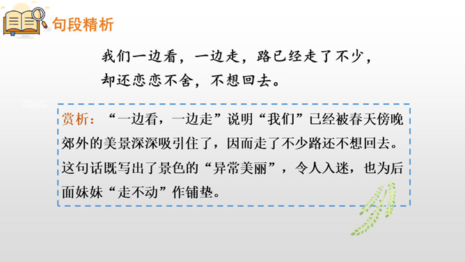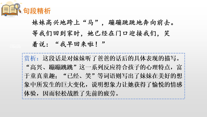 赏析:“一边看,一边走”说明“我们”已经被春天傍晚郊外的美景深深吸引住了,因而走了不少路还不想回去。这句话既写出了景色的“异常美丽”,令人入迷,也为后面妹妹“走不动”作铺垫。赏析:这段话是对妹妹听了爸爸的话后的具体表现的描写。“高兴、蹦蹦跳跳”这一系列反应符合孩子的心理特点,富于童真童趣;“已经、笑”等词语则写出了妹妹在美好的想象中所发生的巨大变化,说明想象力让她获得了愉悦的情感体验,因而轻松战胜了先前的疲劳。所属专题:一匹出色的马ppt。