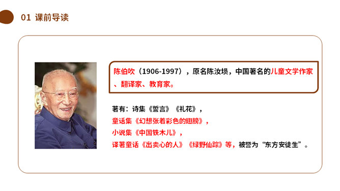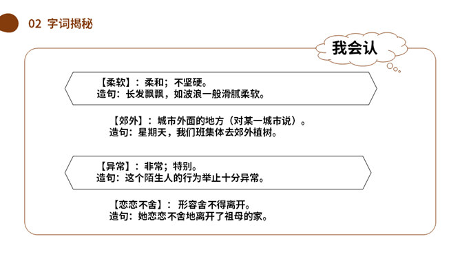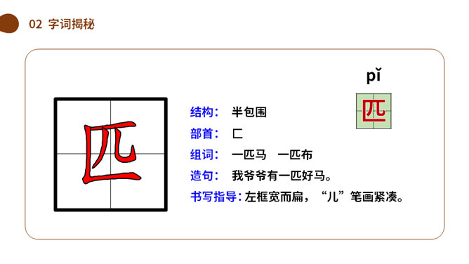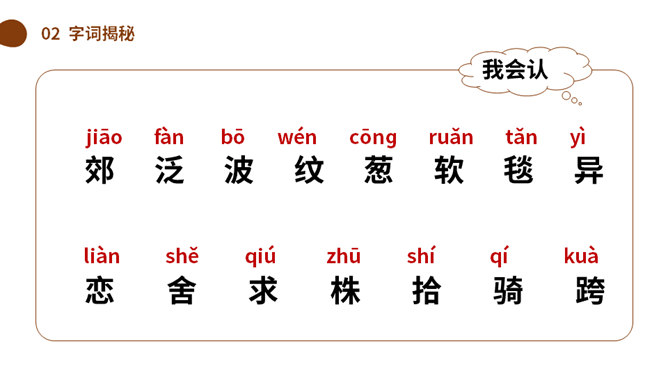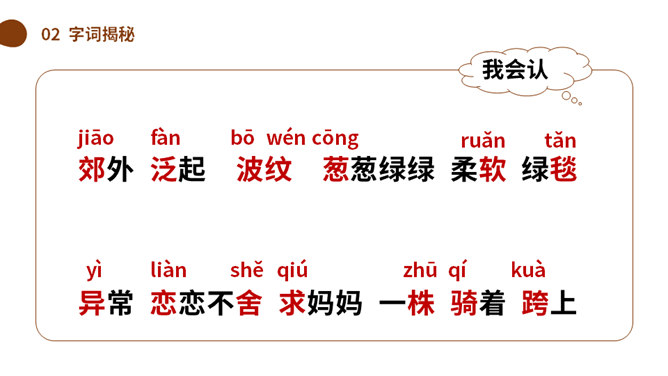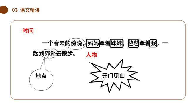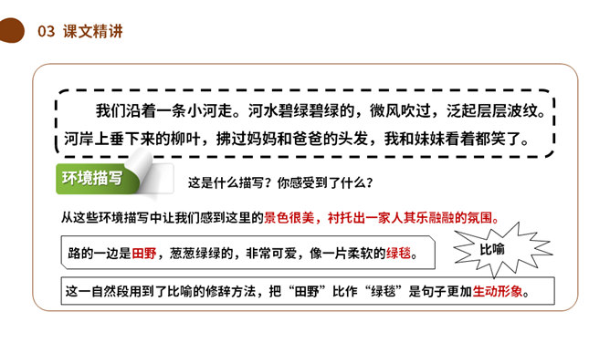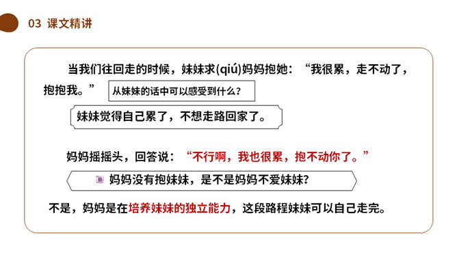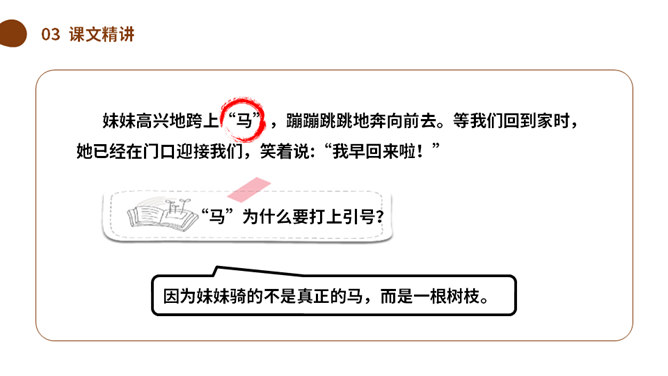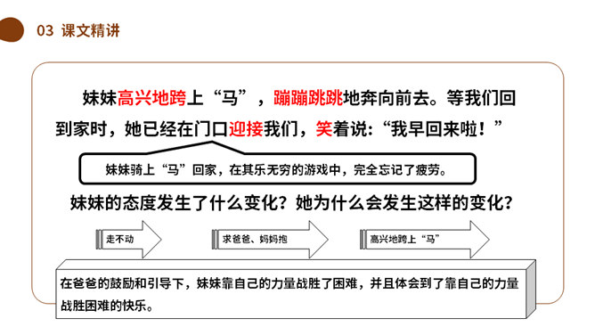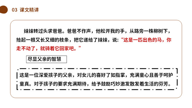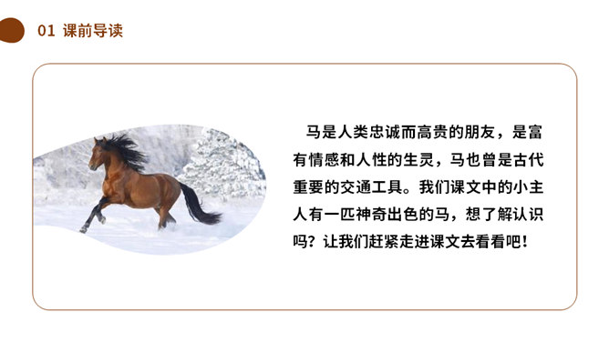 马是人类忠诚而高贵的朋友,是富有情感和人性的生灵,马也曾是古代重要的交通工具。我们课文中的小主人有一匹神奇出色的马,想了解认识吗?让我们赶紧走进课文去看看吧!1)不认识的字可以看拼音,或者请教老师和同学。(2)读准每一个字的字音,圈出生字词;(3)读通每个句子,读不通顺的多读几遍;(4)给每个自然段写上序号。 这是一篇短小而优美的散文,以春天的郊外为背景,以一个孩子的口吻讲述了一家四口郊游,返回时“妹妹”求父母抱,却得到“一匹出色的马”快乐回家的故事。所属专题:一匹出色的马ppt。