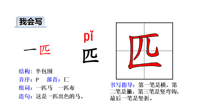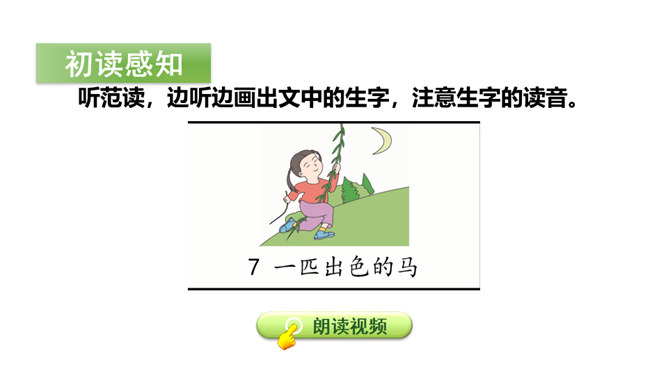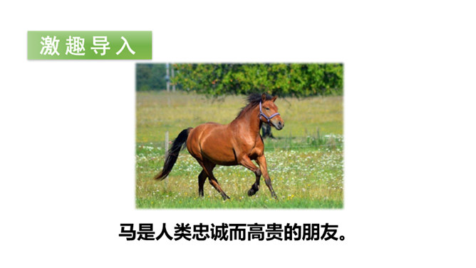 我们课文中的小主人有一匹神奇出色的马,想了解认识吗?听范读,边听边画出文中的生字,注意生字的读音。请同学们自由朗读课文,努力读准字音、读通句子。指名读课文,同学互评:字音是否正确,句子是否通顺。初读课文后,你感受到了什么?示例:初读课文后,我感受到了教育智慧的重要性。所属专题:一匹出色的马ppt。