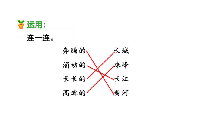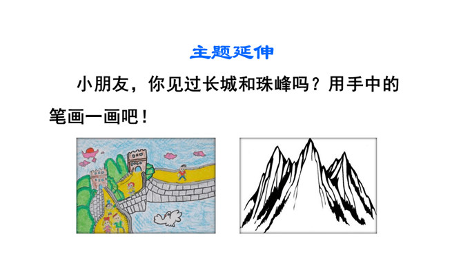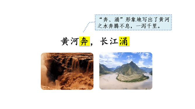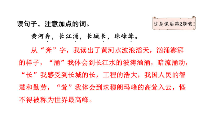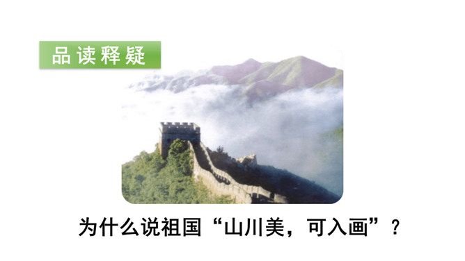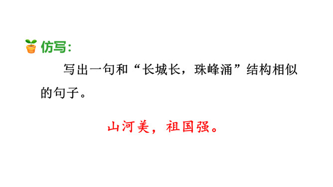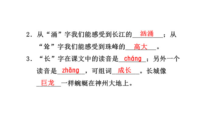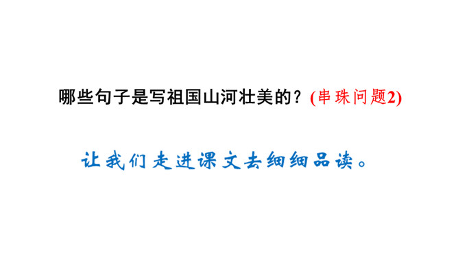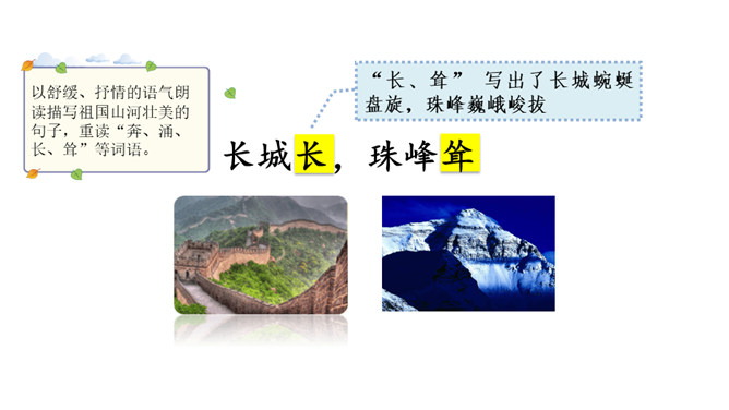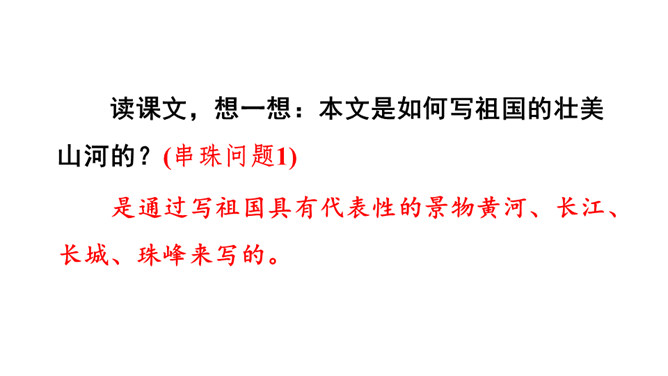 让我们用摘苹果的方法来复习一下上节课认识的生字宝宝吧!读课文,想一想:本文是如何写祖国的壮美山河的?(串珠问题1)是通过写祖国具有代表性的景物黄河、长江、长城、珠峰来写的。哪些句子是写祖国山河壮美的?(串珠问题2)让我们走进课文去细细品读。写出一句和“长城长,珠峰涌”结构相似的句子。山河美,祖国强。你从哪里体会到台湾是祖国领土的一部分?(串珠问题3)如何实现繁荣富强的中国梦?所属专题:神州谣ppt。