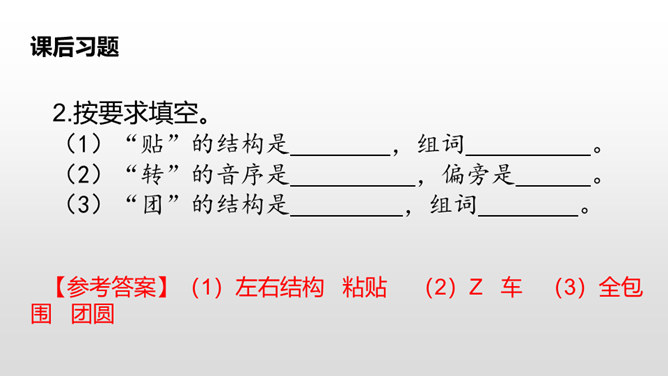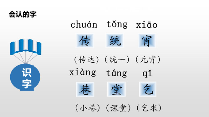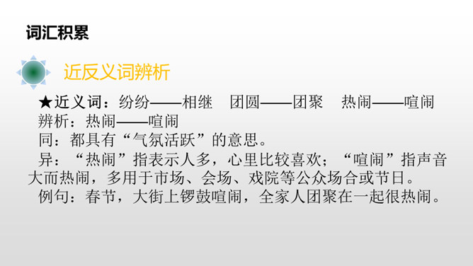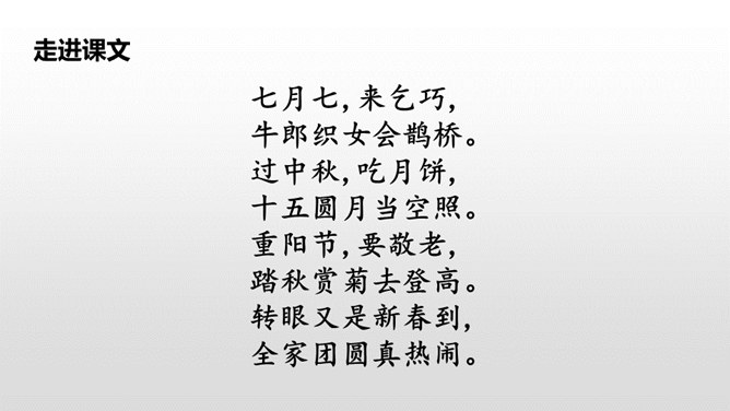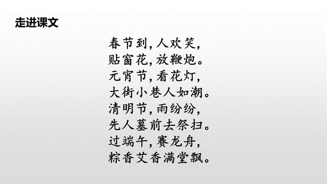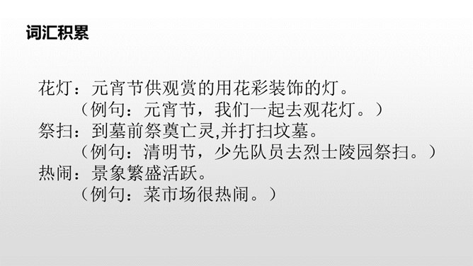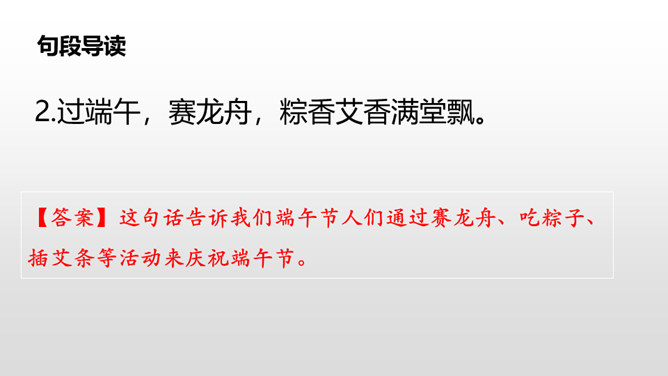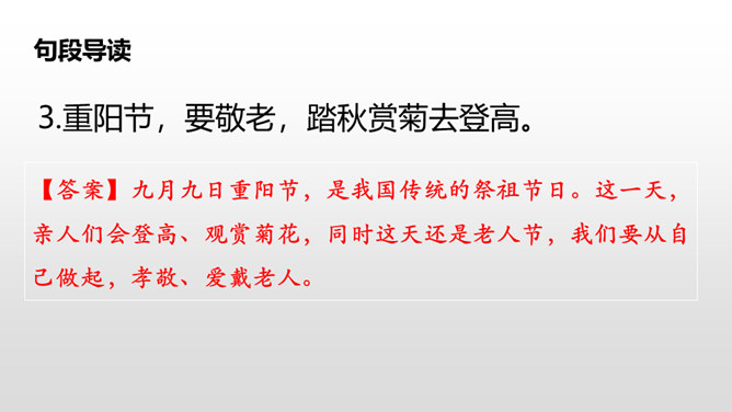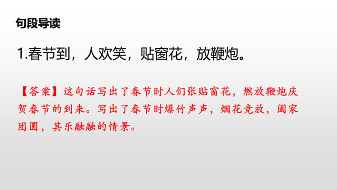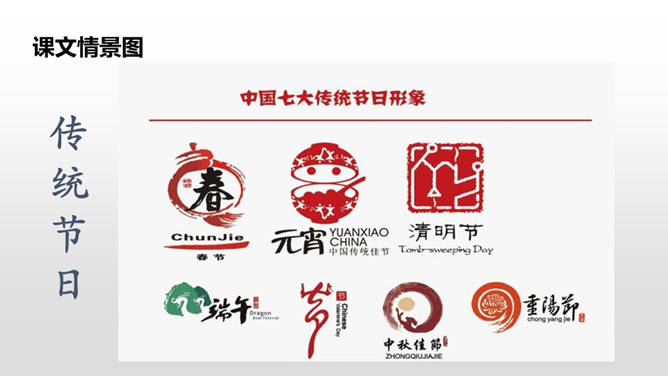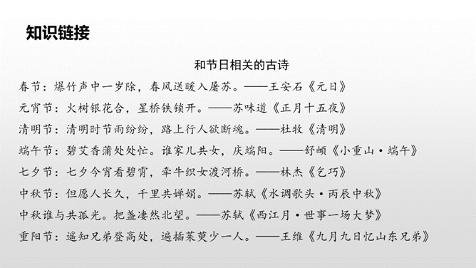 这句话写出了春节时人们张贴窗花,燃放鞭炮庆贺春节的到来。写出了春节时爆竹声声,烟花竞放,阖家团圆,其乐融融的情景。这句话告诉我们端午节人们通过赛龙舟、吃粽子、插艾条等活动来庆祝端午节。九月九日重阳节,是我国传统的祭祖节日。这一天,亲人们会登高、观赏菊花,同时这天还是老人节,我们要从自己做起,孝敬、爱戴老人。所属专题:传统节日ppt。