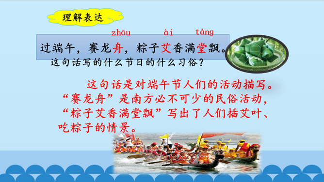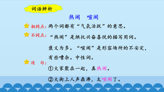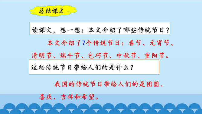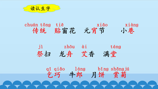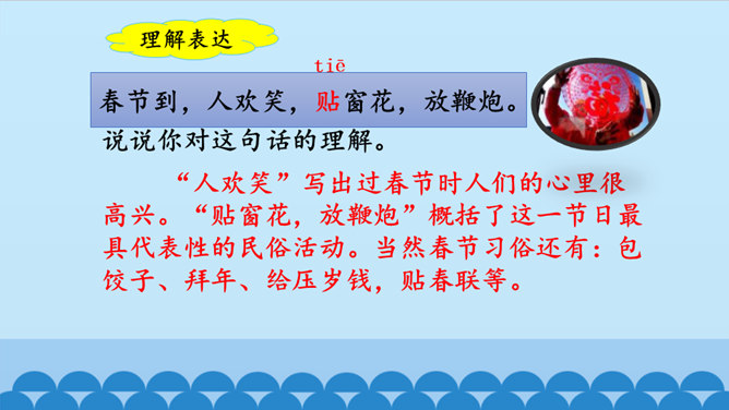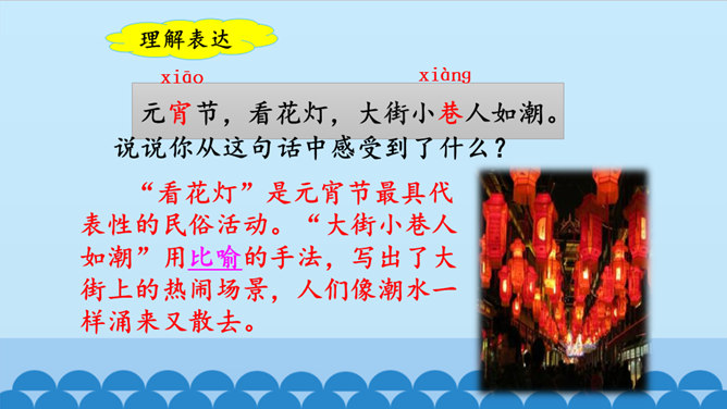 1.看课文,画出生字词,读准字音、注意字形,画出不理解的词语。2.想一想:课文主要写了什么?“人欢笑”写出过春节时人们的心里很高兴。“贴窗花,放鞭炮”概括了这一节日最具代表性的民俗活动。当然春节习俗还有:包饺子、拜年、给压岁钱,贴春联等。“看花灯”是元宵节最具代表性的民俗活动。“大街小巷人如潮”用比喻的手法,写出了大街上的热闹场景,人们像潮水一样涌来又散去。所属专题:传统节日ppt。