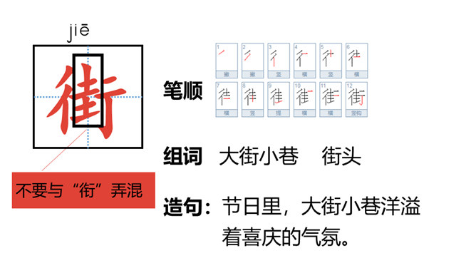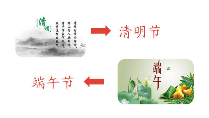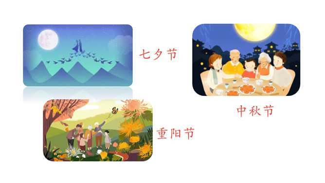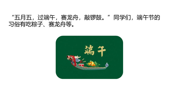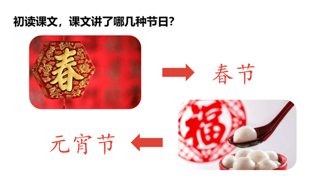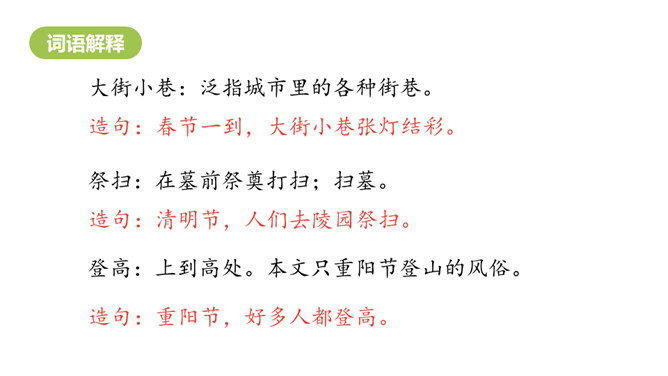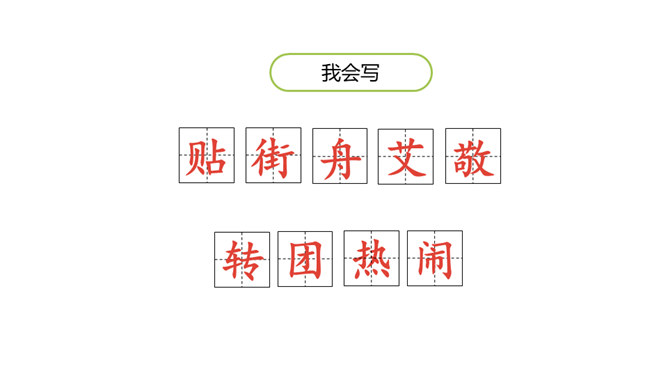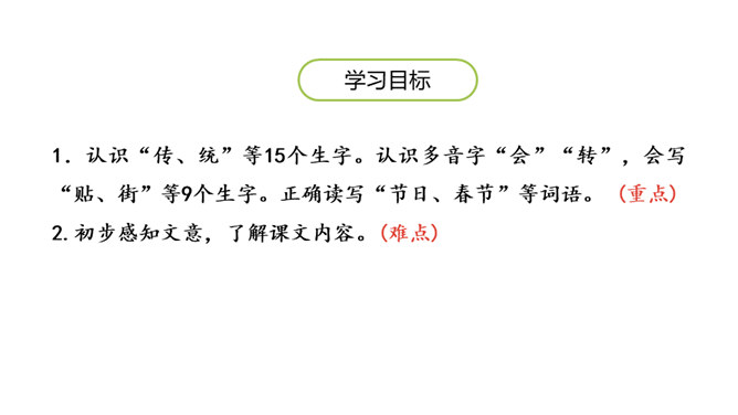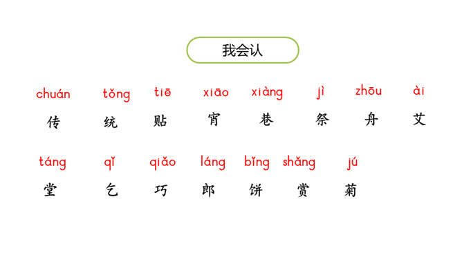 1.认识“传、统”等15个生字。认识多音字“会”“转”,会写“贴、街”等9个生字。正确读写“节日、春节”等词语。 (重点)2.初步感知文意,了解课文内容。(难点)五月五,过端午,赛龙舟,敲锣鼓。”同学们,端午节的习俗有吃粽子、赛龙舟等。大街小巷:泛指城市里的各种街巷。造句:春节一到,大街小巷张灯结彩。祭扫:在墓前祭奠打扫;扫墓。造句:清明节,人们去陵园祭扫。登高:上到高处。本文只重阳节登山的风俗。所属专题:传统节日ppt。