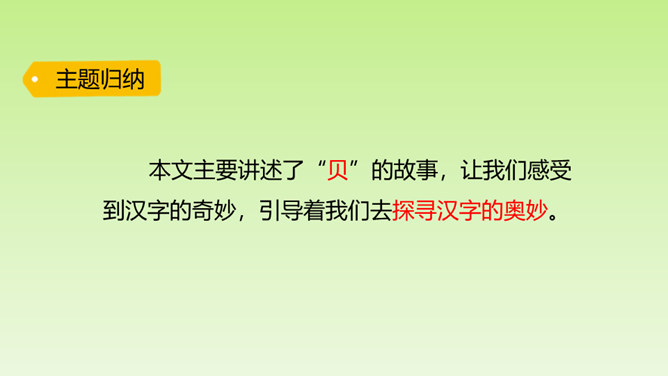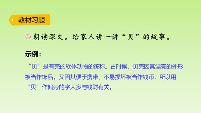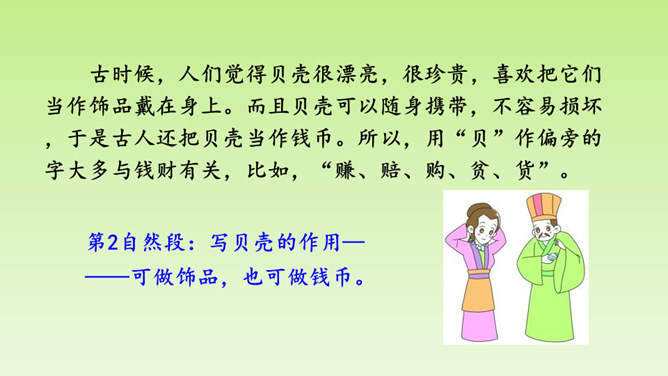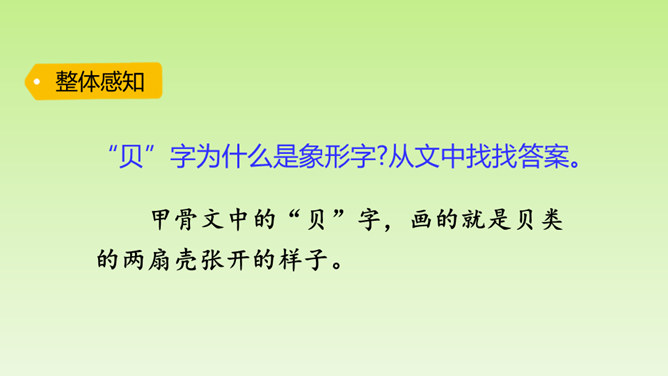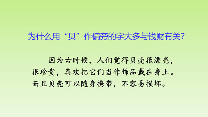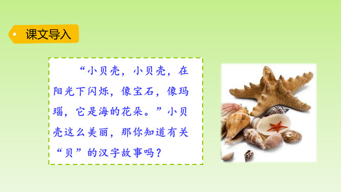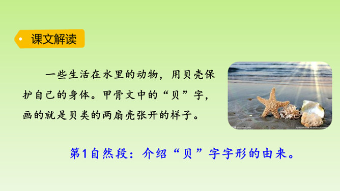“小贝壳,小贝壳,在阳光下闪烁,像宝石,像玛瑙,它是海的花朵。”小贝壳这么美丽,那你知道有关“贝”的汉字故事吗?“贝”字为什么是象形字?从文中找找答案。甲骨文中的“贝”字,画的就是贝类的两扇壳张开的样子。为什么用“贝”作偏旁的字大多与钱财有关?因为古时候,人们觉得贝壳很漂亮,很珍贵,喜欢把它们当作饰品戴在身上。而且贝壳可以随身携带,不容易损坏。第1自然段:介绍“贝”字字形的由来。所属专题:贝的故事ppt。